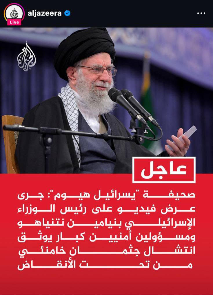 الناطق باسم جيش الاحتلال يؤكد مزاعم اغتيال المرشد العام للثورة الإيرانية “علي خامنئي”، وصحيفة “يسرائيل هيوم” تقول أنه جرى عرض فيديو على رئيس وزراء الاحتلال “بنيامين نتنياهو” ومسؤولين أمنيين كبار يوثق انتشال جثمان خامنئي من تحت الأنقاض