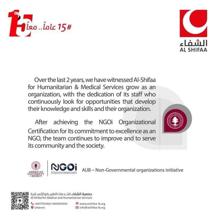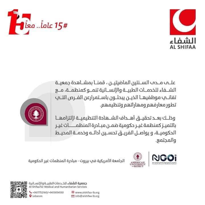 أشادت الجامعة الأميركية بعمل جمعية الشفاء وتفانيها بالخدمة الإنسانية، وأكدت الجامعة أن جمعية الشفاء دائماً تبحث عن فرص لتطور معارف ومهارات طاقم العمل.