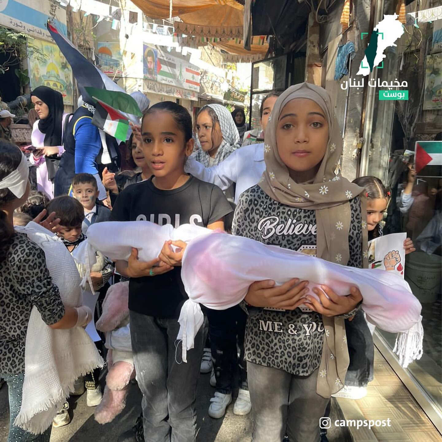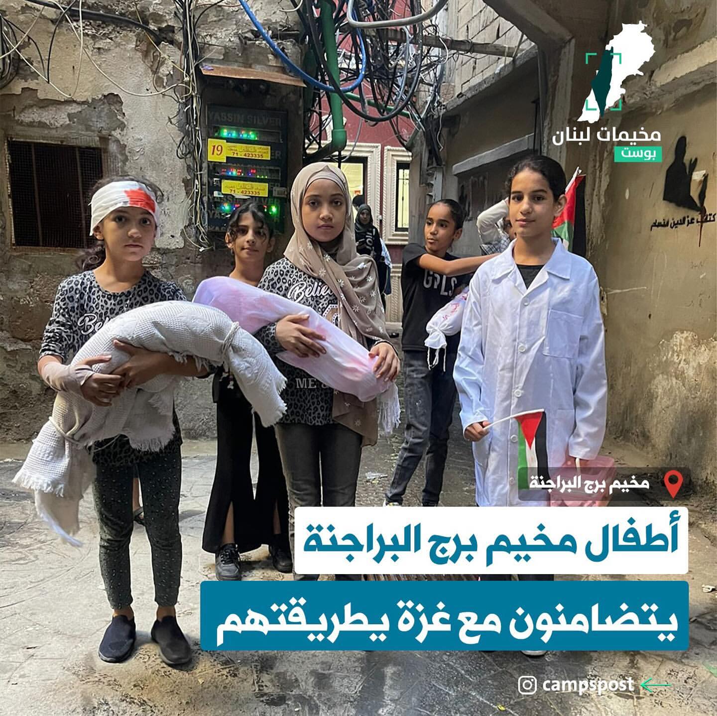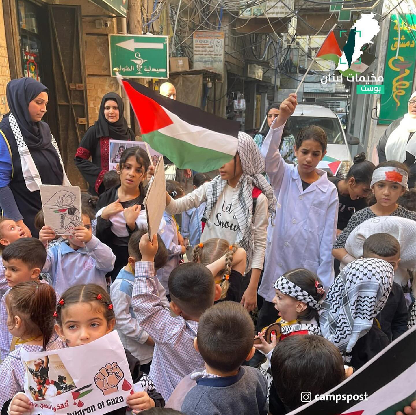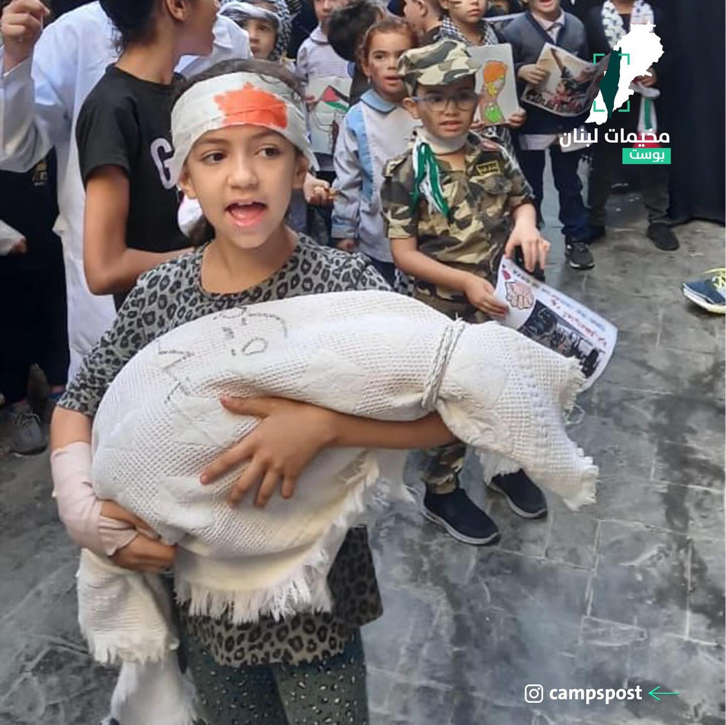 جال أطفال روضة براعم الاقصـ.ـى أزقة مخيم برج البراجنة، في مشهدية مماثلة لما يحصل في غزة من حرب ابادة ودمار.