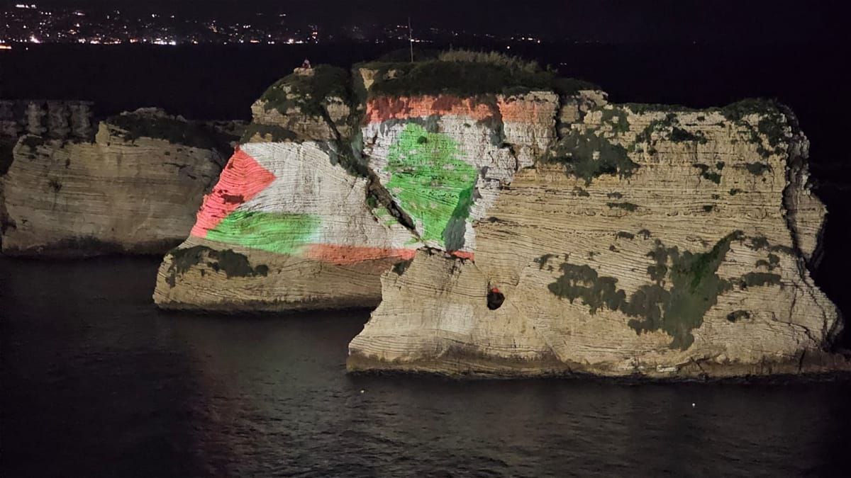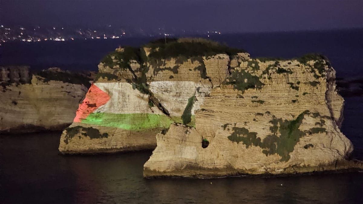 صخرة الروشة تُضاء بالعلم الفلسطينيّ