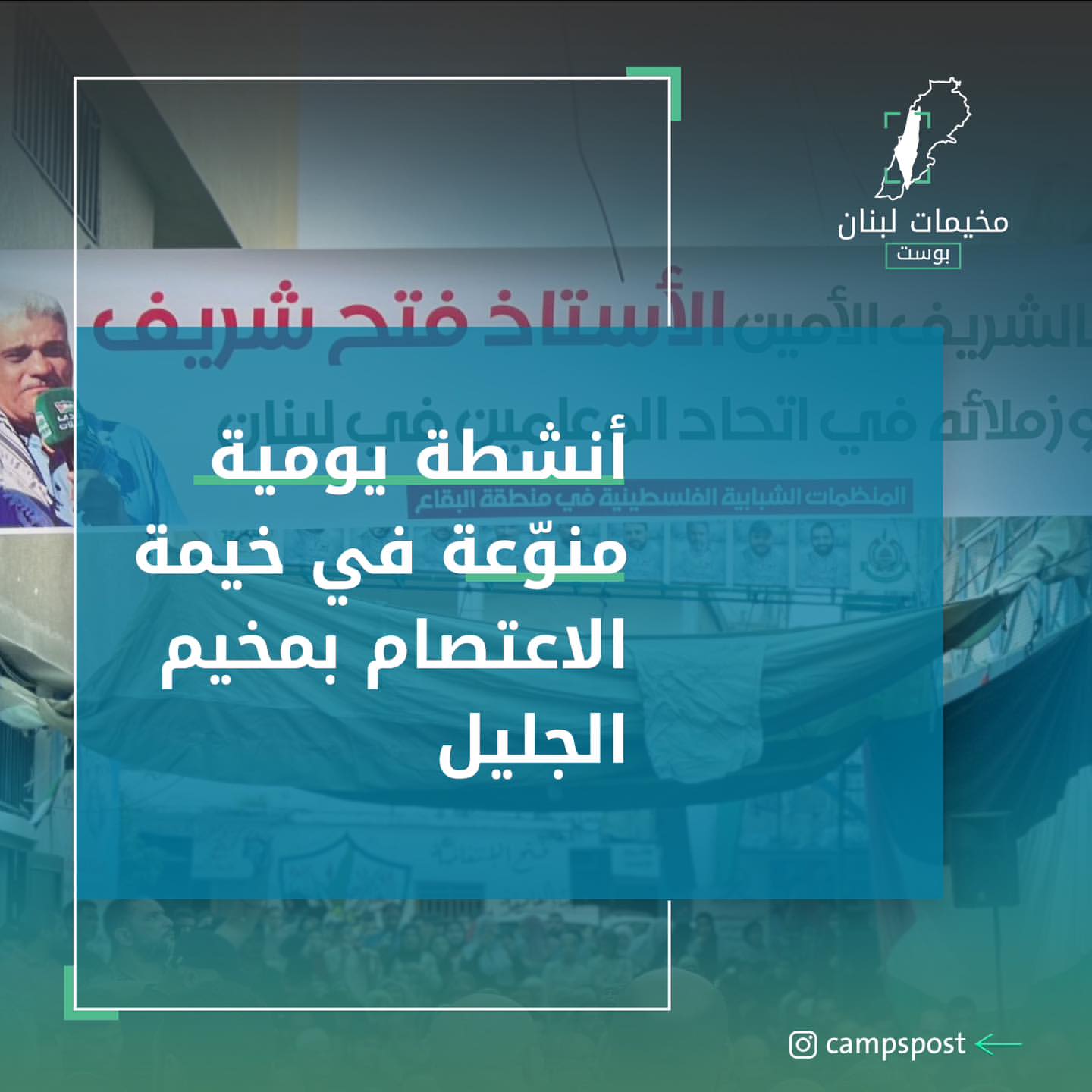 خيمة الاعتصام في مخيّم الجليل، نصرة لأهلنا في غـزّö والضفّة واستنكارًا لقرارات الأونروا التعسّفيّة بحقّ موظّفيها واللّاجئين، بدعوة من المنظّمات الشبابيّة الفلسطينيّة في منطقة البقاع وبمشاركة اتّحاد المعلّمين في لبنان وهيئة علماء فلسطين وفعاليات وطنية.