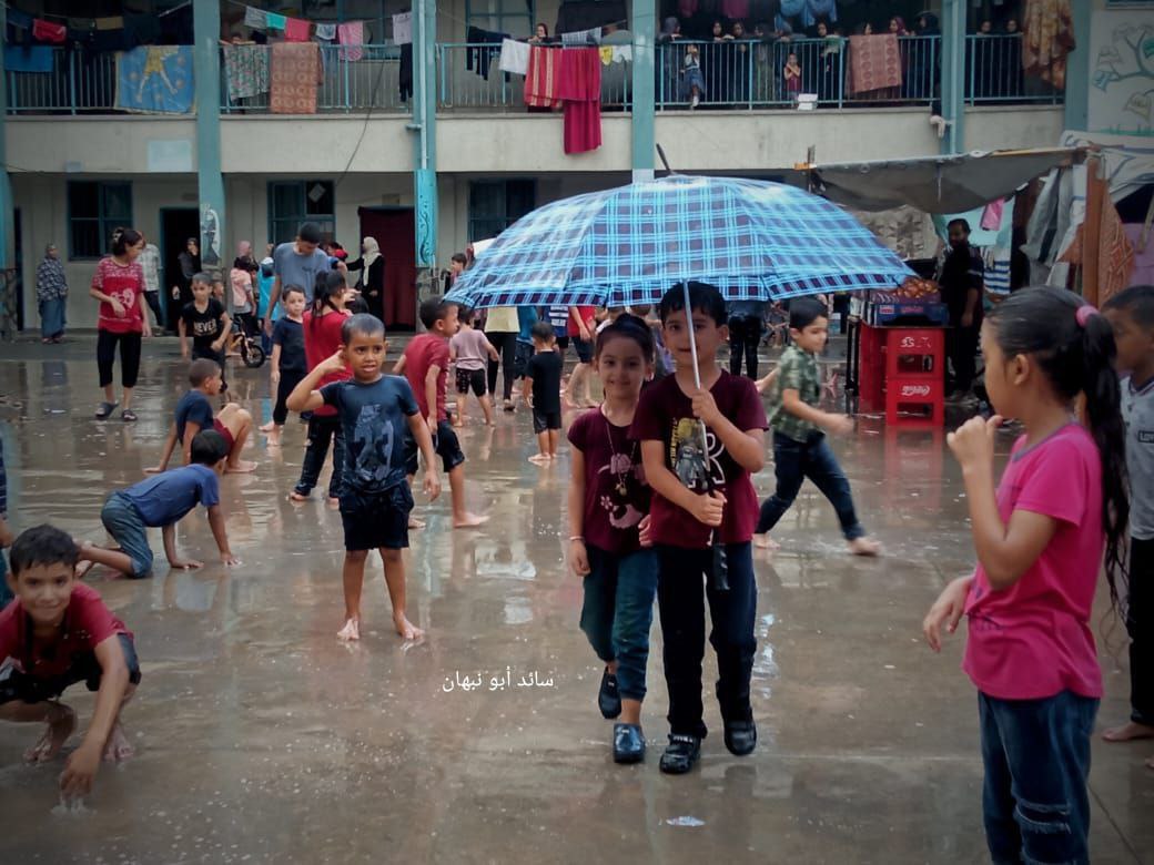 🔴 فرحة الأطفال داخل مراكز الإيواء مع تساقط الأمطار الغزيرة في مخيم النصيرات وسط قطاع غزة.