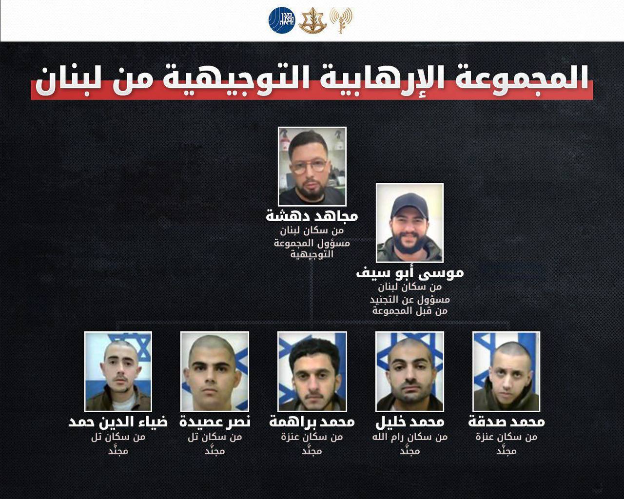 نشر المتحدث باسم جيش الاحتلال بيانا ادعى فيه أن جهاز الشاباك أحبط نشاط خلية "إرهابية" عملت في منطقة الضفة الغربية في الاراضي المحتلة، وادعت أن هذه الخلية تم تحريكها من قبل عناصر في لبنان، حيث طُلب من أفرادها تصوير بلدة في الضفة وتنفيذ تدريبات تمهيدًا لتنفيذ "عملية تخريبية.'' وادعى المتحدث باسم جيش الاحتلال أنه في شهر أكتوبر الأخير، وفي إطار عملية مشتركة لجيش الاحتلال وجهاز الشاباك، تم توقيف المدعو "محمد صدقة" من سكان قرية عنزة في الضفة الغربية وأحيل للتحقيق. وزعمت المصادر أنه أثناء التحقيق تبين أن صدقة غادر إلى لبنان، حيث تم تجنيده من قبل عنصر يُدعى موسى أبو سيف، الملقب بـ”جبريل”، لتنفيذ نشاطات في الضفة وتجنيد عناصر لتشكيل خلايا عسكرية. وادعت المصادر أنه بعد عودته من لبنان إلى الضفة عبر الأردن، قام صدقة بتجنيد عدد من العناصر الأخرى لتنفيذ العمليات، ومن بينهم محمد خليل من رام الله ومحمد براهمة من عنزة، اللذين تم توقيفهما أيضًا للتحقيق من قبل الشاباك. وزعمت المصادر أنه تبين خلال التحقيق مع صدقة أنه استمر في التواصل مع "المجموعة الإرهابية" اللبنانية عبر شبكات التواصل الاجتماعي وتطبيقات الألعاب. وادعت المصادر أنه تم اكتشاف خلية أخرى تحركها نفس المجموعة اللبنانية، حيث تم توقيف اثنين من سكان قرية تل التي في الضفة الغربية، ضياء الدين حمد وناصر عصيدة، في العشرينات من العمر، وأُحيلوا للتحقيق من قبل الشاباك. وزعمت المصادر أنه في إطار التحقيق معهما تبين أن عنصرًا لبنانيًا يُدعى مجاهد استعان بعدد من العناصر اللبنانية الأخرى، بينهم “أبو أحمد” و”أبو وحيد”، للتواصل مع الموقوفين عبر شبكات التواصل الاجتماعي ومنصات أخرى، وأنه تم إجراء تدريبات على إطلاق النار، وطلب منهم تصوير مستوطنة وتم الاتفاق على تحويل أموال لصالح شراء الأسلحة. وزعمت مصادر الاحتلال أن التحقيقات وجمع المعلومات الاستخبارية أظهرت أن من يترأس المجموعة التي جندت أفراد الخليتين هو المدعو "مجاهد دهشة" من لبنان، والتي زعمت مصادر الاحتلال انه مرتبط بعلاقات مع عناصر حماس. هذا وذكر بيان الاحتلال انه تم تقديم "لوائح اتهام" بحق العناصر الخمسة من سكان الضفة الغربية .