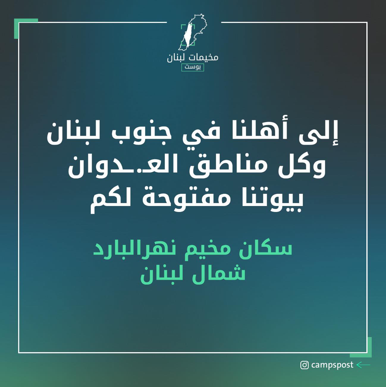 أعلن السكان في مخيم نهرالبارد، شمال لبنان، عن فتح بيوتهم لأهلنا النازحين من مناطق العـ.ـدوان المختلفة. كما أفادت مصادر محلية أن الأونروا افتتحت المدارس بالمخيم وقامت بتجهيزها مبدئياً.
