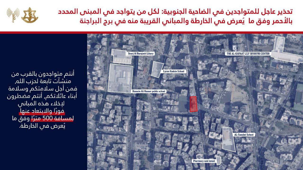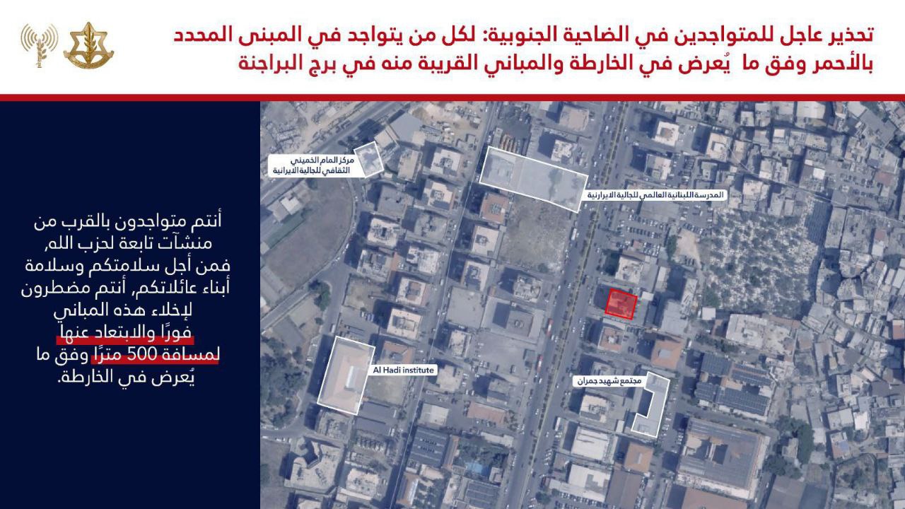 المتحدث بأسم جيش الاحتلال ينشر تهديدات متتالية بالاخلاء إلى سكان مناطق في الضاحية الجنوبية لبيروت وخصوصاً سكان منطقة برج البراجنة