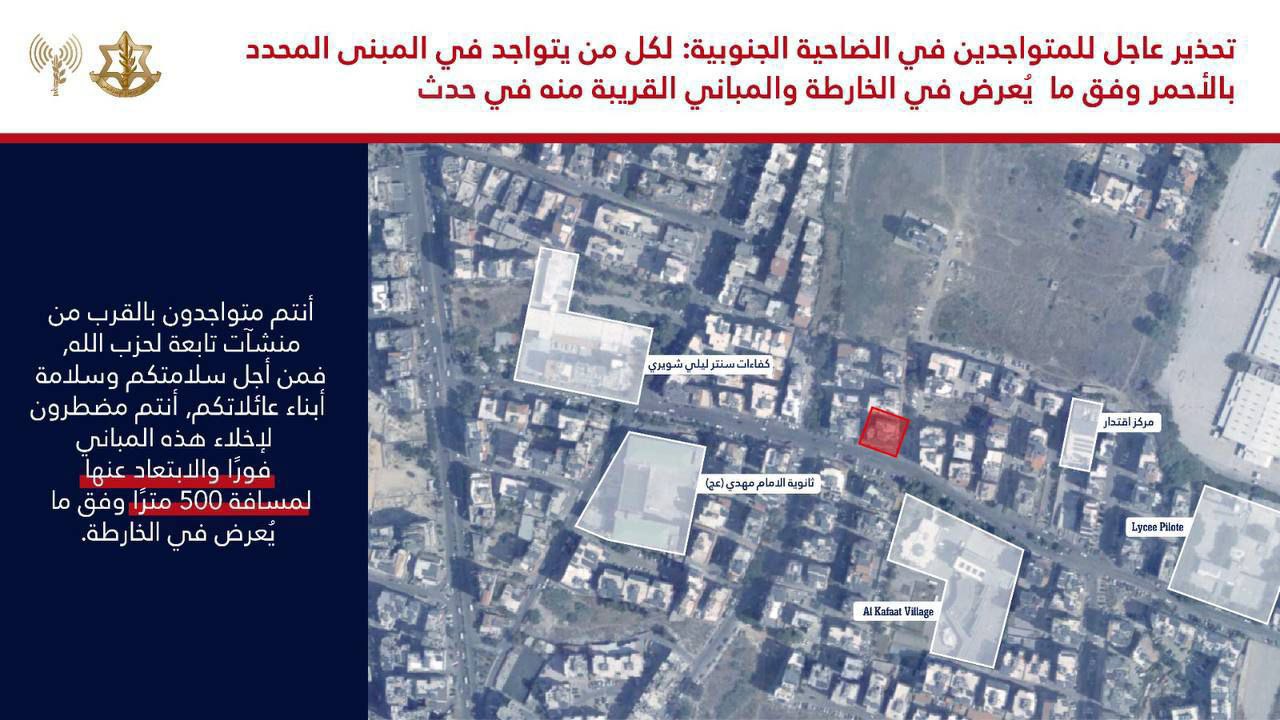 الاحتلال الإسرائيلي يهدد مناطق جديدة بالضاحية ويطالب باخلاء اماكن فيها - مخيمات لبنان بوست