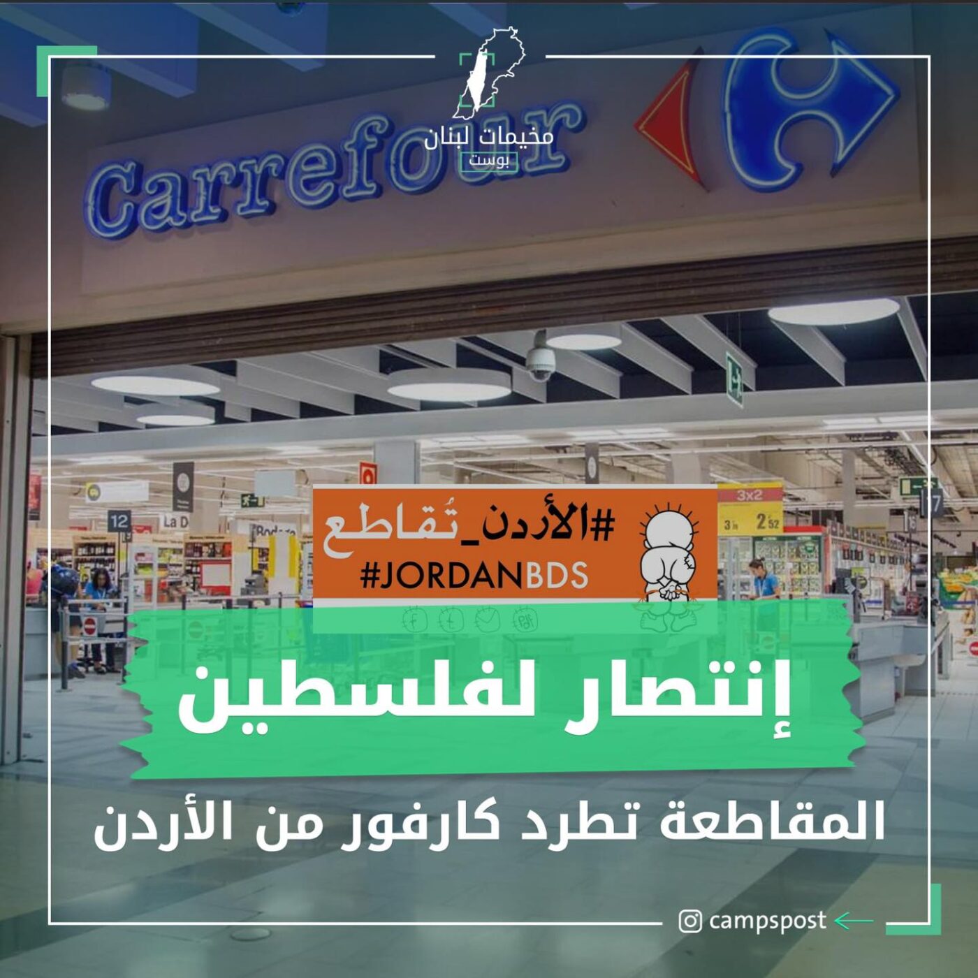 أعلنت سلسلة “كارفور”التجارية في الأردن، اغلاق مراكزها وانسحابها من السوق الأردنية جرّاء تعرضها لحملة مقاطعة شرسة من المستهلكين الأردنيين. يُذكر أيضاً، أن علامة “أميريكانا” التجارية اعترفت بخسائر كبيرة في أسهمها بسبب تعاظم حركة المقاطعة، هذه العلامة التي تضم KFC وغيرها من العلامات التجارية البارزة.