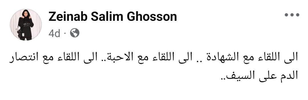 آخر ما كتبته المصورة الصحفية زينب سليم غصن التي استشهدت مع عائلتها في المجزرة التي ارتكبها الاحتلال بعد قصف مبنى سكني في جون في جبل لبنان مساء أمس