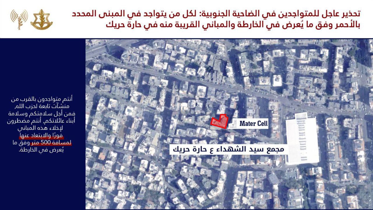 جيش الاحتلال يهدد من جديد مبانٍ سكنية في حارة حريك وبرج البراجنة بالضاحية الجنوبية لبيروت ويطالب بإخلاءها