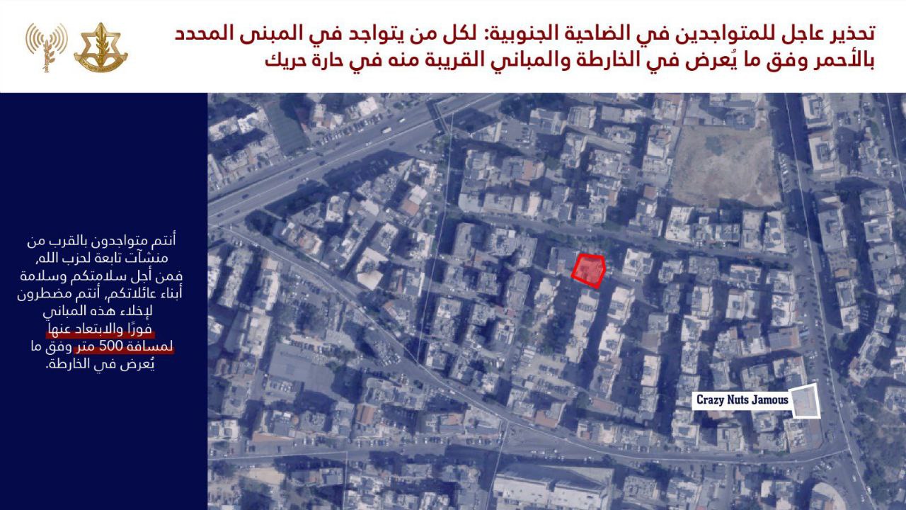 جيش الاحتلال يهدد مبانِ سكنية في حارة حريك و حدث بيروت بالضاحية الجنوبية لبيروت ويطالب بإخلاءها