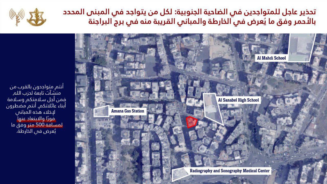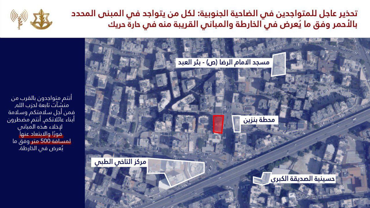 جيش الاحتلال يهدد بقصف مباني سكنية في منطقة برج البراجنة وحارة حريك والغبيري بالضاحية الجنوبية لبيروت ويطالب بإخلاءها