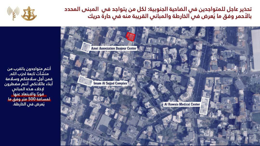 جيش الاحتلال يهدد سكان منطقة حارة حريك وبرج البراجنة في الضاحية الجنوبية لبيروت ويطالبهم بالإخلاء