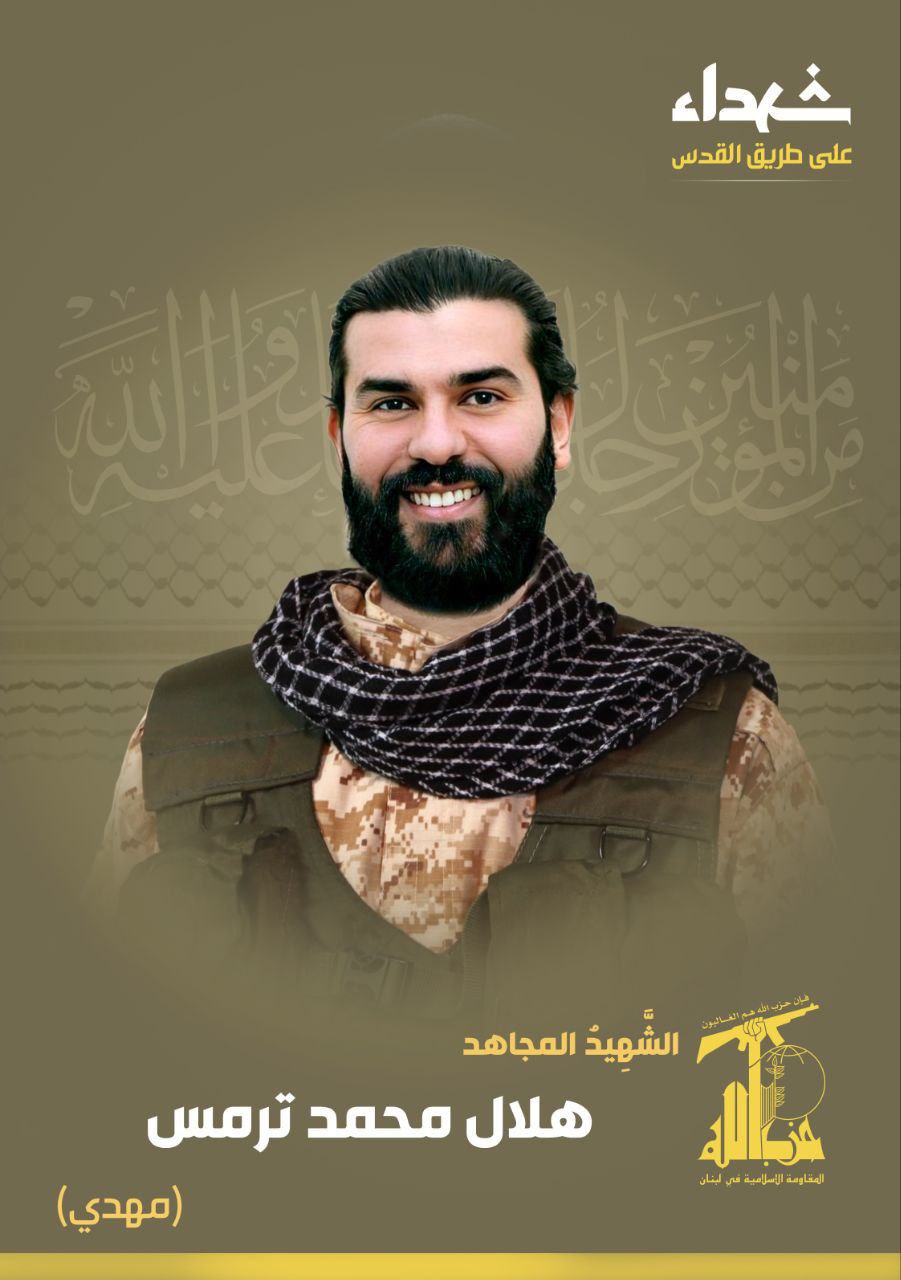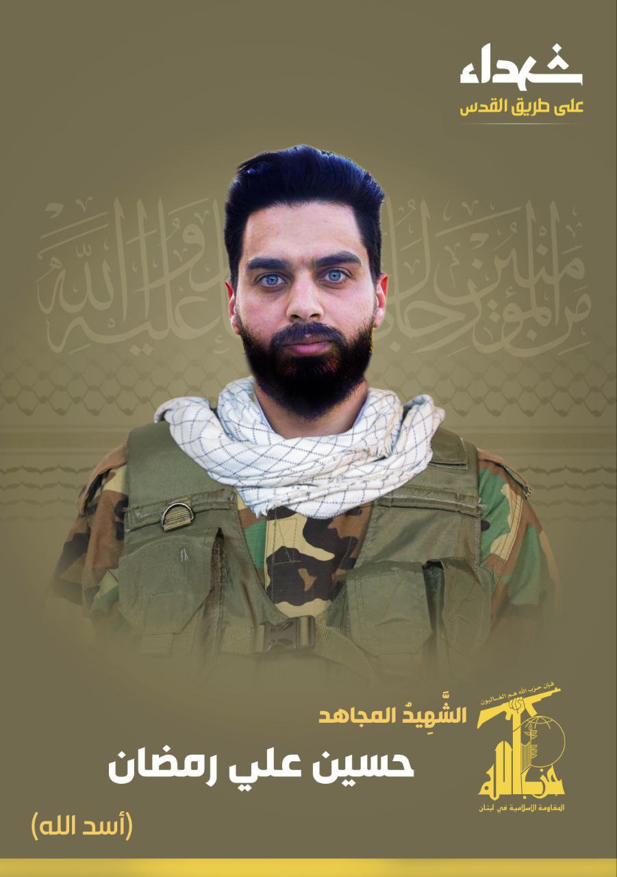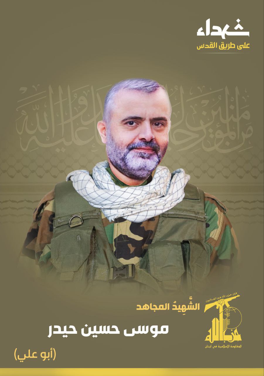 حزب الله ينعي 4 من مجاهديه استشهدوا في ذات الغارة الصهيونية التي استهدفت مسؤول العلاقات الإعلامية محمد عفيف النابلسي في بيروت، وهم: ▪️الشهيد الحاج موسى حيدر، مواليد 1969، من بلدة مركبا. ▪️الشهيد الحاج محمود الشرقاوي، مواليد 1970، من بلدة أرزي. ▪️الشهيد هلال ترمس، مواليد 1988، من بلدة طلوسة. ▪️الشهيد حسين رمضان، مواليد 1992، من بلدة عرمتى.