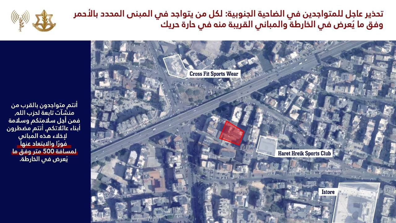 جيش الاحتلال يهدد سكان منطقة حارة حريك والغبيري في الضاحية الجنوبية لبيروت
