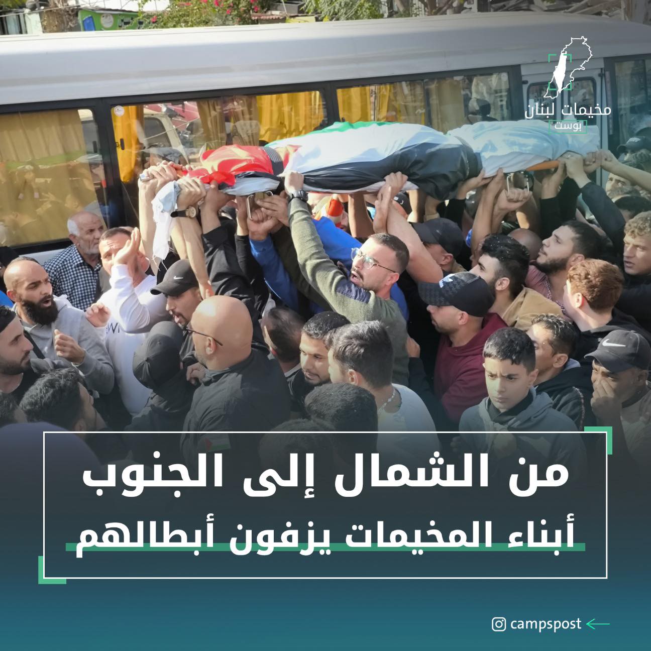 زفّ أبناء المخيمات الفلسطينية في لبنان، خمسة من خيرة شبابهم، ارتقوا خلال صد العـ.ـدوان في جنوب لبنان. من مخيم البداوي شمالاً، حيث خرج الالاف في تشبيع ثلاثة أبطال، إلى مخيم عين الحلوة جنوباً الذي خرج سكانه بالالاف أيضاً لزفاف اثنين من ابناءهم. باعثين برسالة واضحة “أن المخيمات لم تبخل يوماً في بذل الغالي والنفيس على درب فلسـ.ـطين”