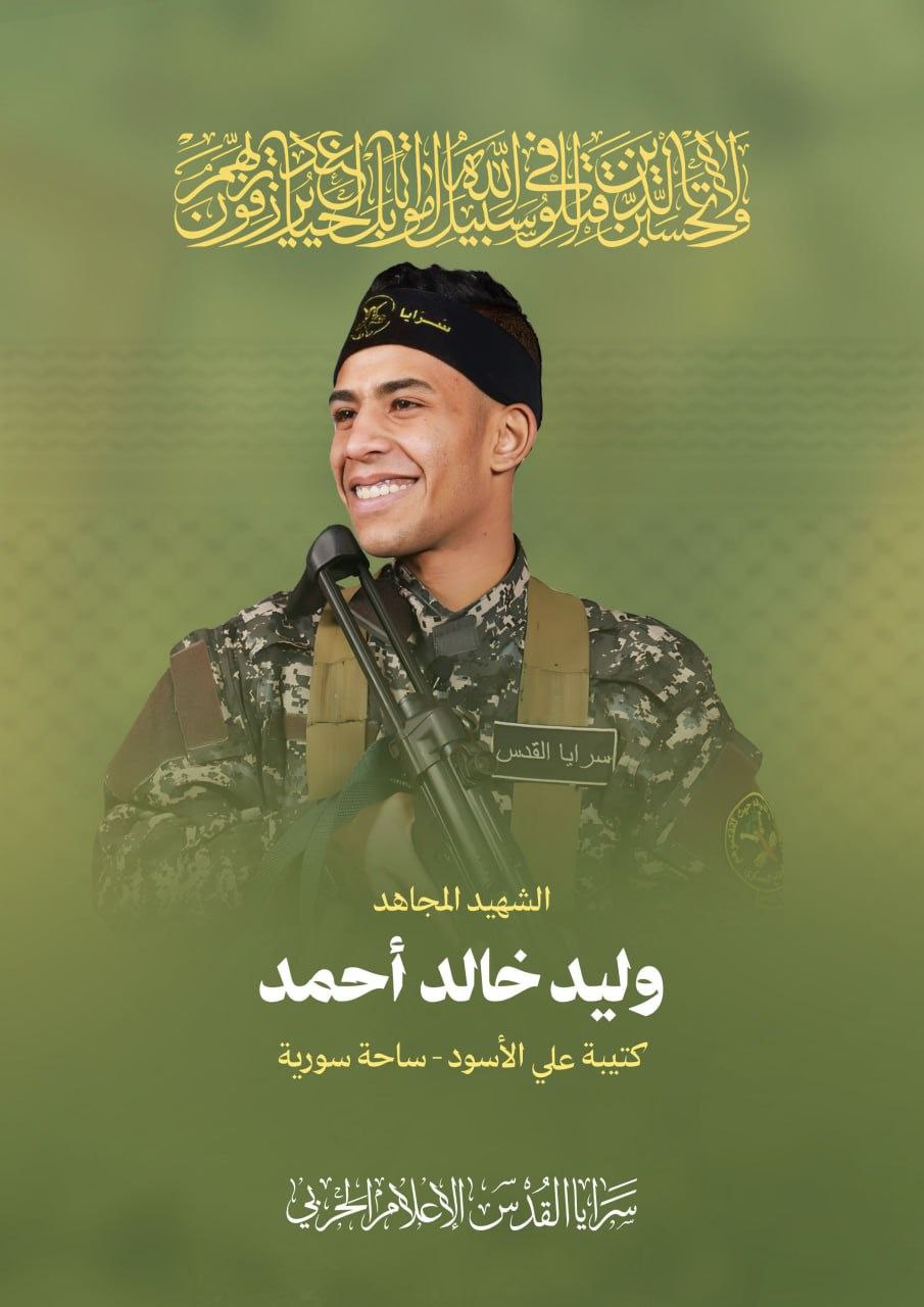 بسم الله الرحمن الرحيم “فَرِحِينَ بِمَا آتَاهُمُ اللَّهُ مِن فَضْلِهِ وَيَسْتَبْشِرُونَ بِالَّذِينَ لَمْ يَلْحَقُوا بِهِم مِّنْ خَلْفِهِمْ أَلَّا خَوْفٌ عَلَيْهِمْ وَلَا هُمْ يَحْزَنُونَ ” صدق الله العظيم بأسمى آيات الفخر والاعتزاز تزُف سرايا القدس الجناح العسكري لحركة الجهاد الإسلامي في فلسطين إلى شعبنا الفلسطيني المجاهد وإلى الأمتين العربية والإسلامية: -الشهيد المجاهد أحمد محمد الأحمد (35 عام). -الشهيد المجاهد وليد خالد أحمد (20 عام). -الشهيد المجاهد منير خالد فارس (22 عام). من أبطال كتيبة الشهيد علي الأسود – ساحة سورية. والذين ارتقوا على حدود فلسطين المحتلة خلال مشاركتهم بالتصدي للعدوان على لبنان، وتؤكد سرايا القدس أنها ستبقى ثابتة على درب الجهاد والمقاومة حتى التحرير والعودة. ” وإنّه لجهاد نصرٌ أو استشهــــاد ” ســــرايا القــــــــــدس 04 جمادى الآخرة 1446 هــــ الموافق 05 – 12 – 2024