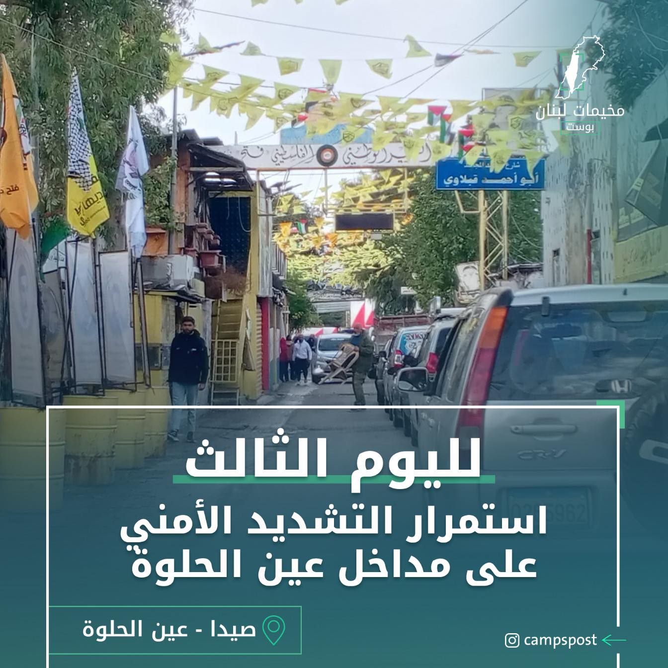 لليوم الثالث على التوالي تستمر اجراءات الجيش اللبناني المشددة على مداخل مخيم عين الحلوة للاجئين الفلسطينين. السكان بدورهم عبروا عن استيائهم من هذا الوضع، مما يضطرهم للاصطفاف في طوابير يومية طويلة، للخروج من المخيم.