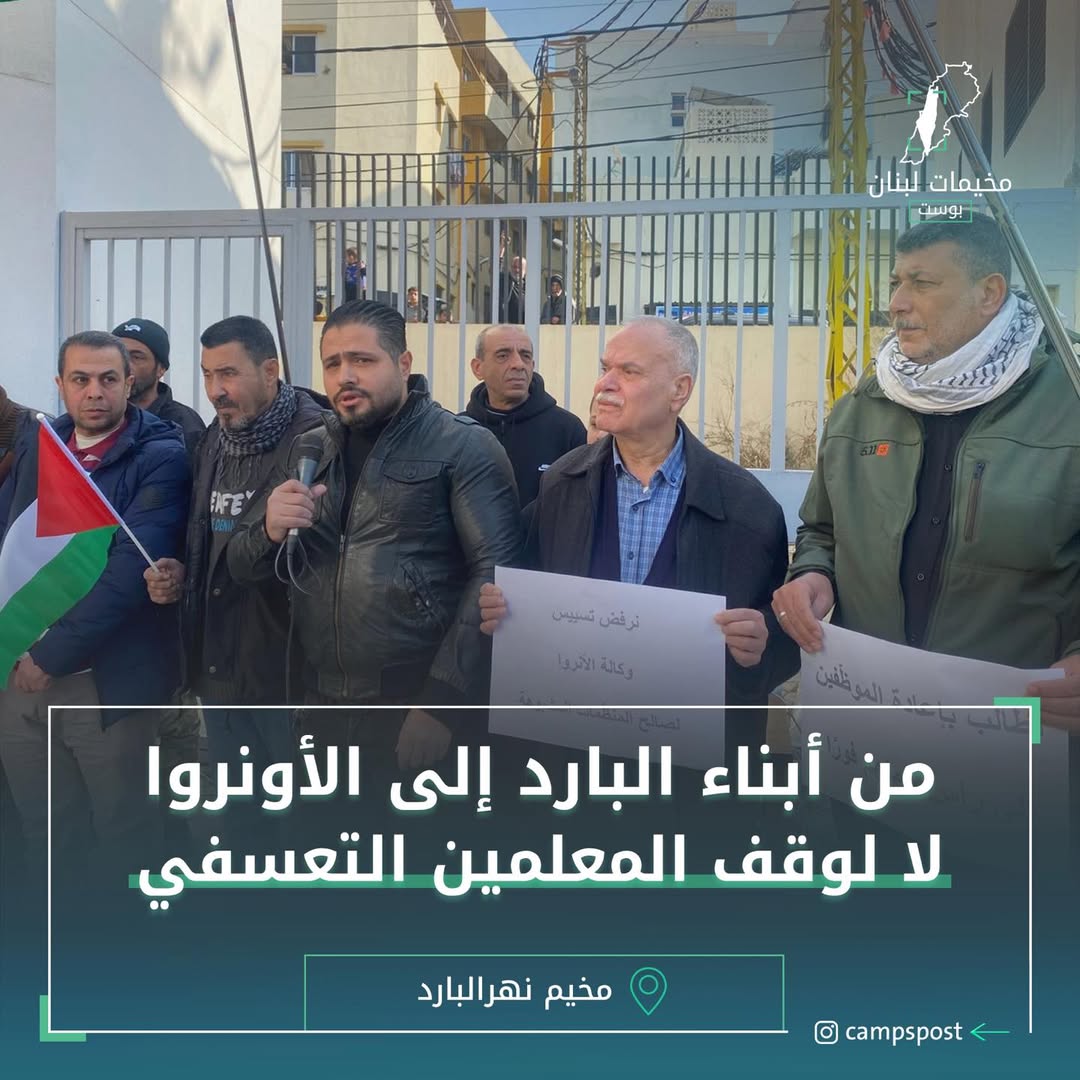 اعتصم عدد من أبناء مخيم نهرالبارد في شمال لبنان، منددين بقرار الاونروا حول إيقاف عدد من المعلمين تعسفياً بحجة مواقفهم الداعمة لفلـ.ـسطين. كما طالب المشاركون بضرورة السماح للمعلمين بالعودة إلى رأس عملهم بأسرع وقت.