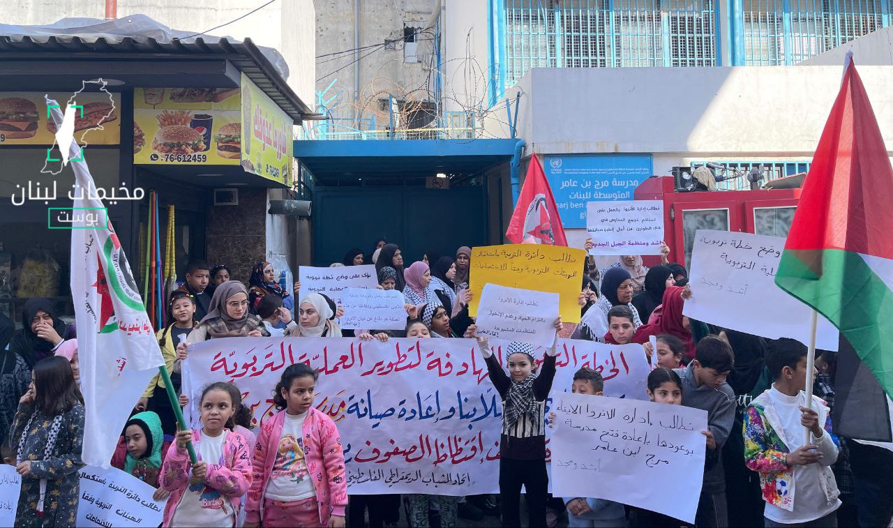 اعتصام أمام مدرسة مرج بن عامر في مخيم عين الحلوة بمدينة صيدا جنوبي لبنا، بدعوة من اتحاد الشباب الديمقراطي “أشد” ومنظمة “الجيل الجديد مجد” للضغط على إدارة الأونروا بتحسين خدماتها و وضع خطة تربوية هادفة لتطوير العملية التربوية وإعادة صيانة مدرسة مرج بن عامر وتخفيف اكتظاظ الصفوف الذي يعرقل العملية التعليمية.