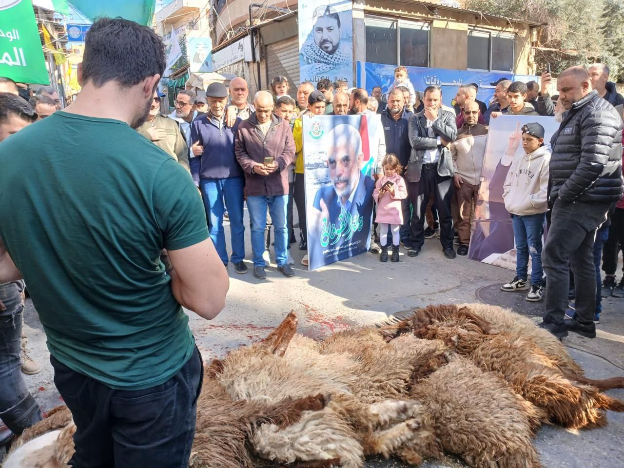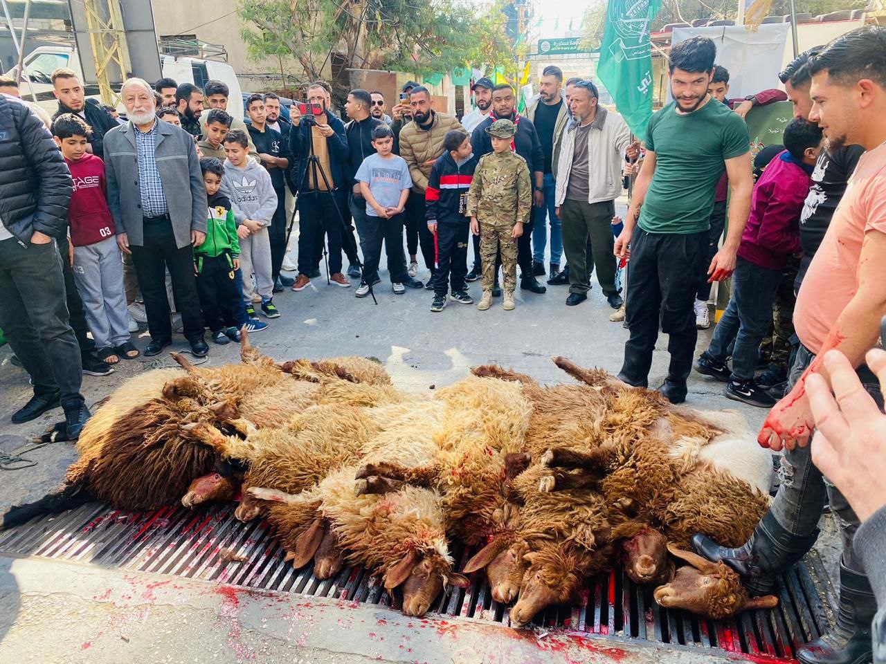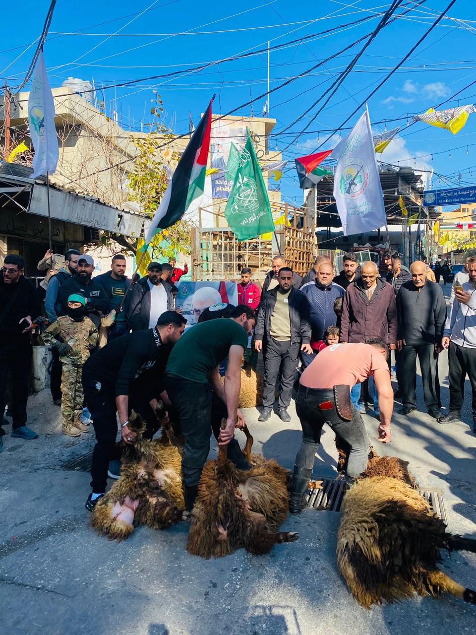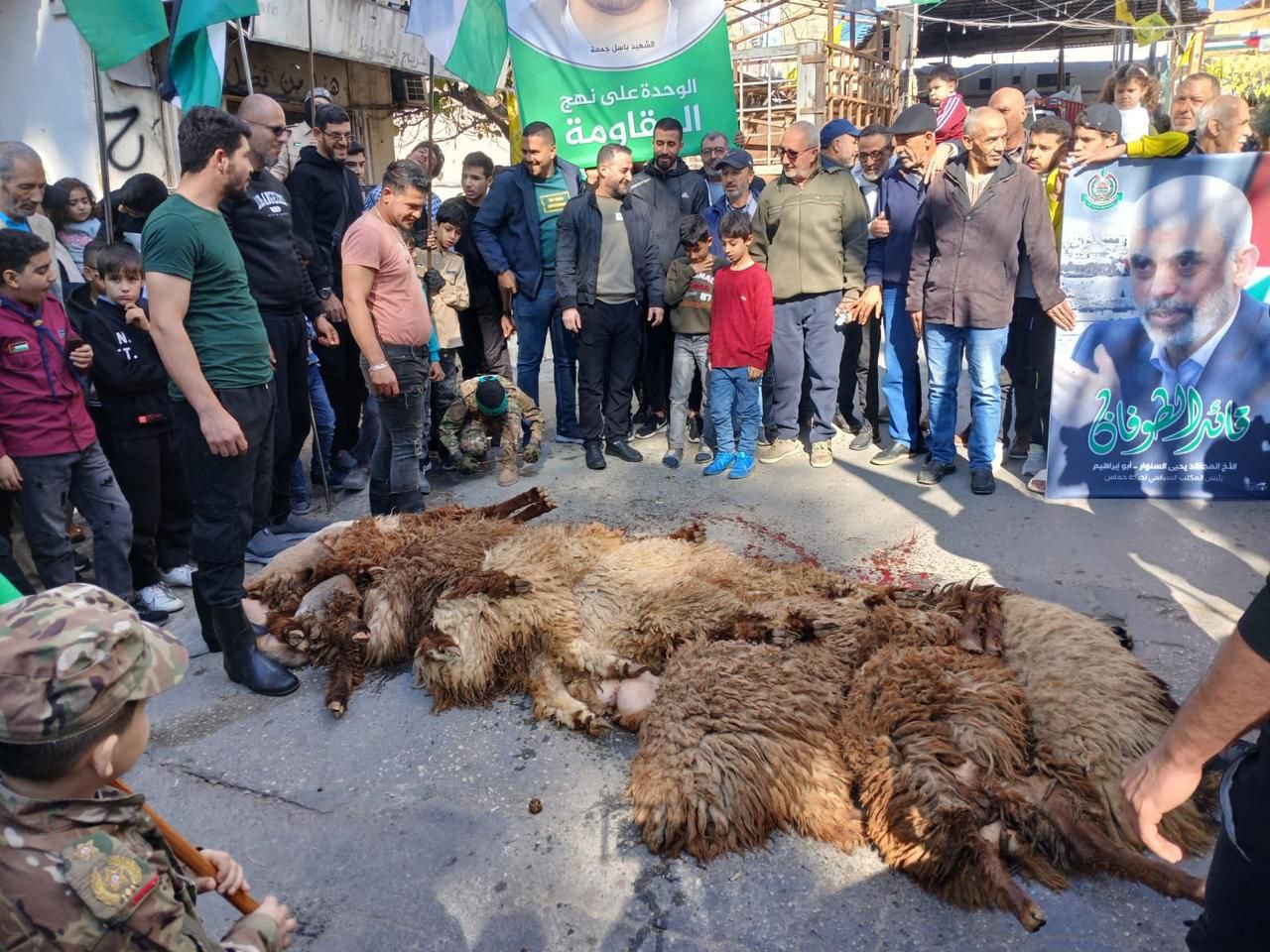 وقفة وذبح خراف أمام مدخل مخيم البرج الشمالي للاجئين الفلسطينيين في مدينة صور جنوبي لبنان ابتهاجاً بوقف إطلاق النار في قطاع غزة وانتصار المقــــاومة.