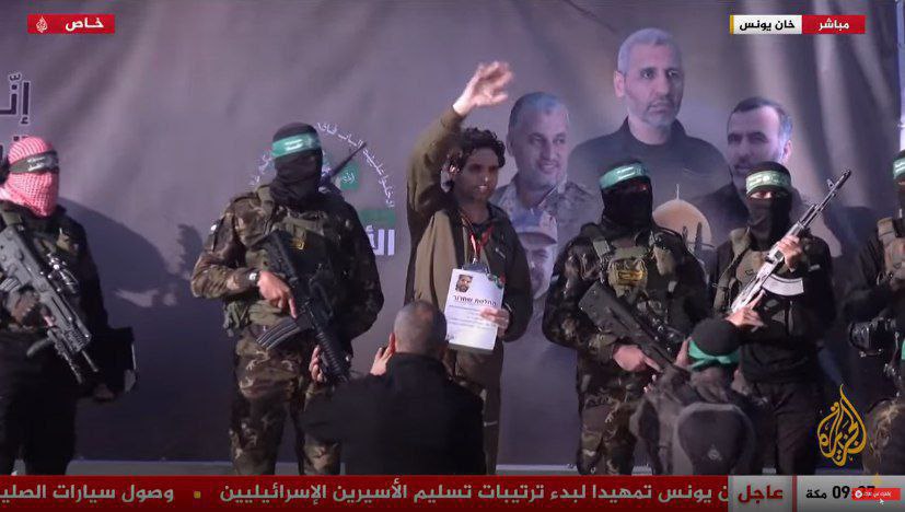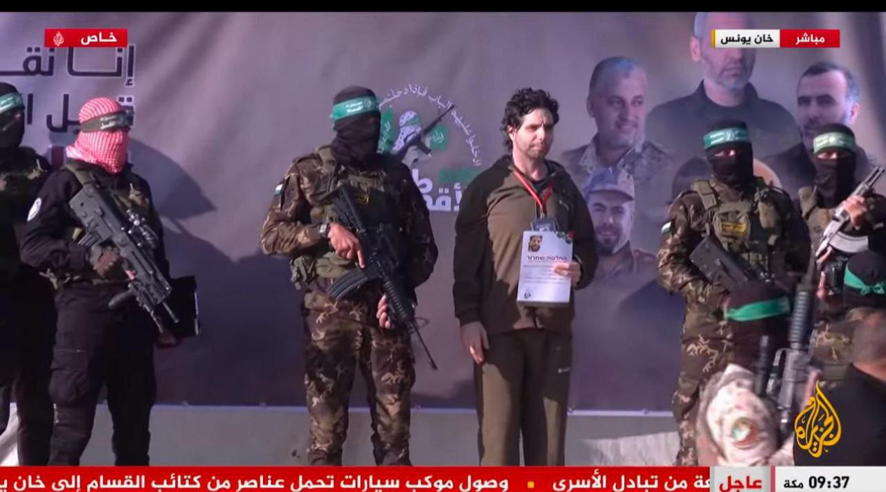 لقطات من لحظة تسليم كتائب القسام للأسير الإسرائيلي عوفر كالديرون إلى الصليب الأحمر ضمن الدفعة الرابعة بالمرحلة الأولى لصفقة التبادل بين المقاومة والاحتلال