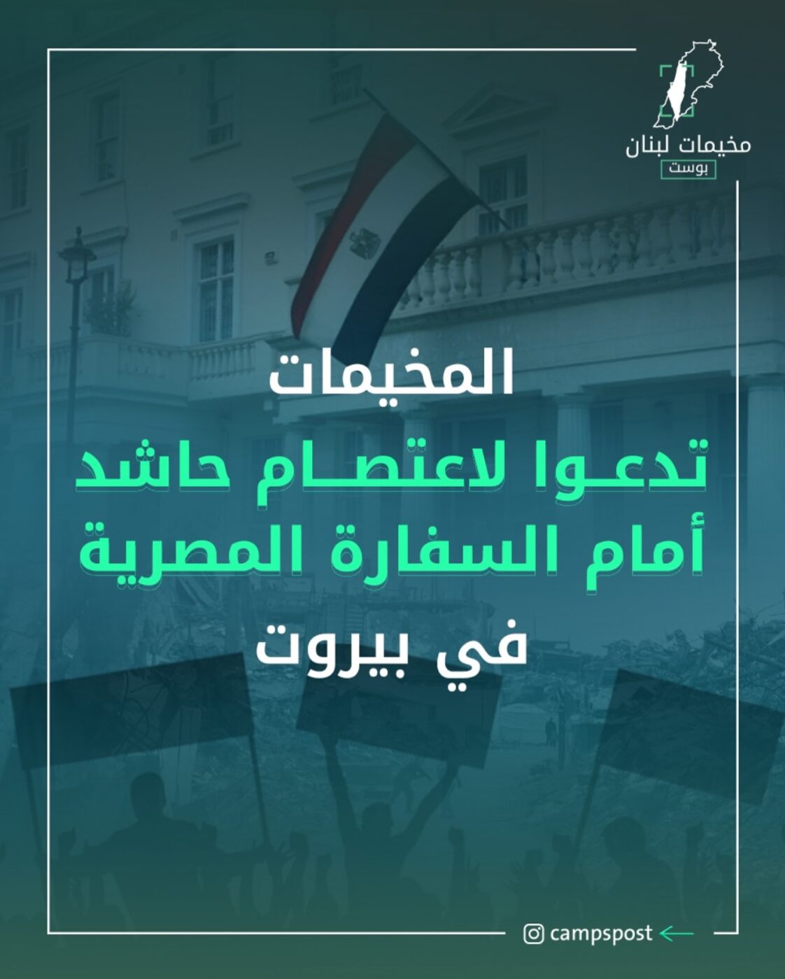 دعا عدد من الناشطين في المخيمات الفلسطينية في لبنان، إلى التوجه غداً الأربعاء إلى السفارة المصرية في بيروت، احتجاجاً على إغلاق معبر رفح ومطالبةً بضرورة إدخال المساعدات الإنسانية إلى القطاع ..