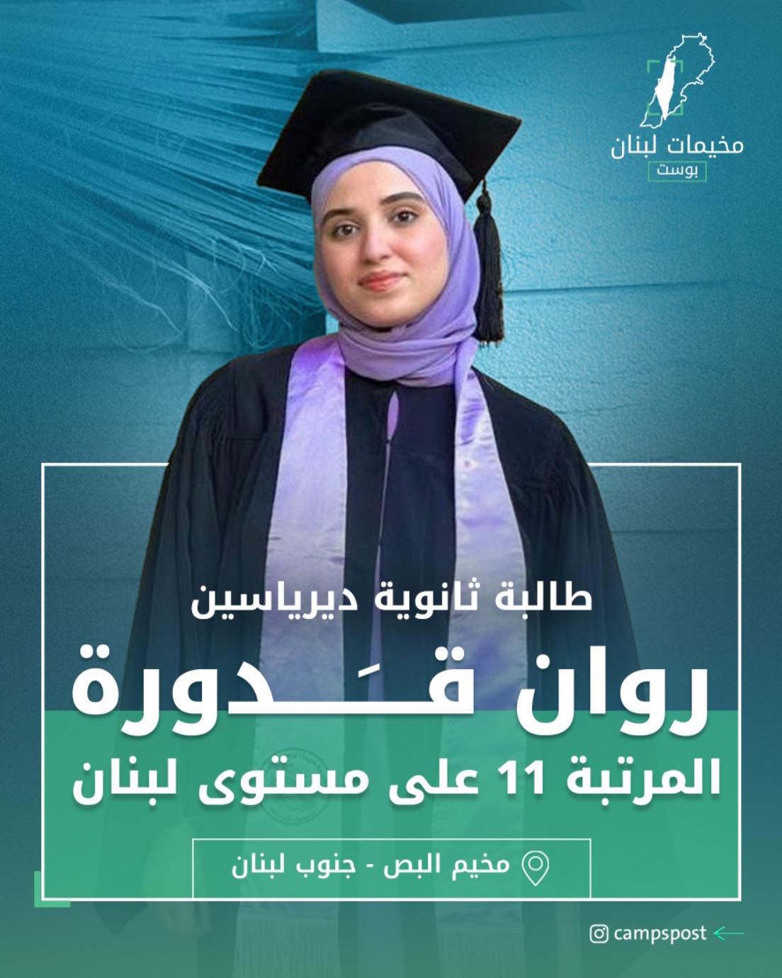 حققت الطالبة الفلسطينية “روان قدورة” ابنة مخيم البص في جنوب لبنان، والتلميذة في مدرسة “دير ياسين” المرتبة 11 على مستوى لبنان في الاقتصاد والاجتماع للشهادة الثانوية العامة اللبنانية.