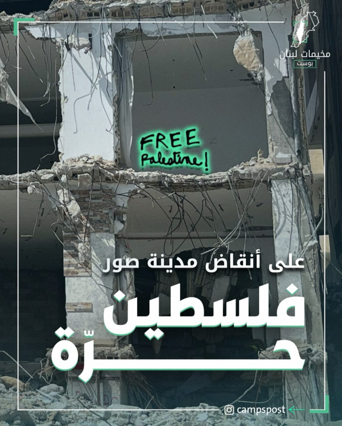 على أنقاض مبنى مدمر في مدينة صور جنوب لبنان، بقيت عبارة “Free Palestine” صامدة وشاهدة على ما حلّ بالجنوب وأهله.