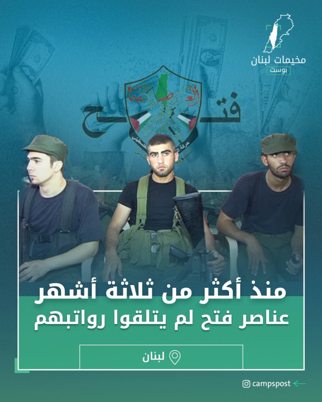 أفاد عدد كبير من منتسبي حركة فتح في لبنان، من ضباط وأفراد، بعدم تلقيهم رواتبهم منذ ثلاثة أشهر، في أزمة لم تقتصر على القطاع العسكري فحسب، بل طالت قطاعات أخرى أيضاً. وتظل الأسباب وراء هذا الانقطاع غير واضحة، حيث يعزوها البعض إلى عوامل تنظيمية وإجرائية تتعلق بالبنوك، فيما يرى آخرون أنها نتيجة خلافات داخلية.