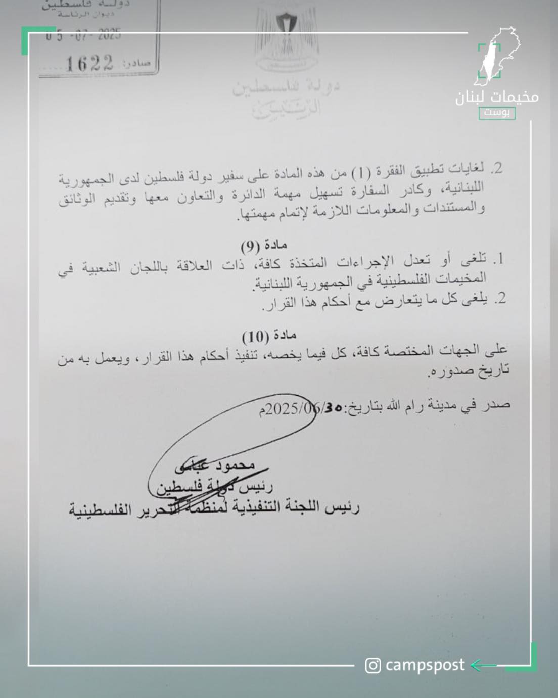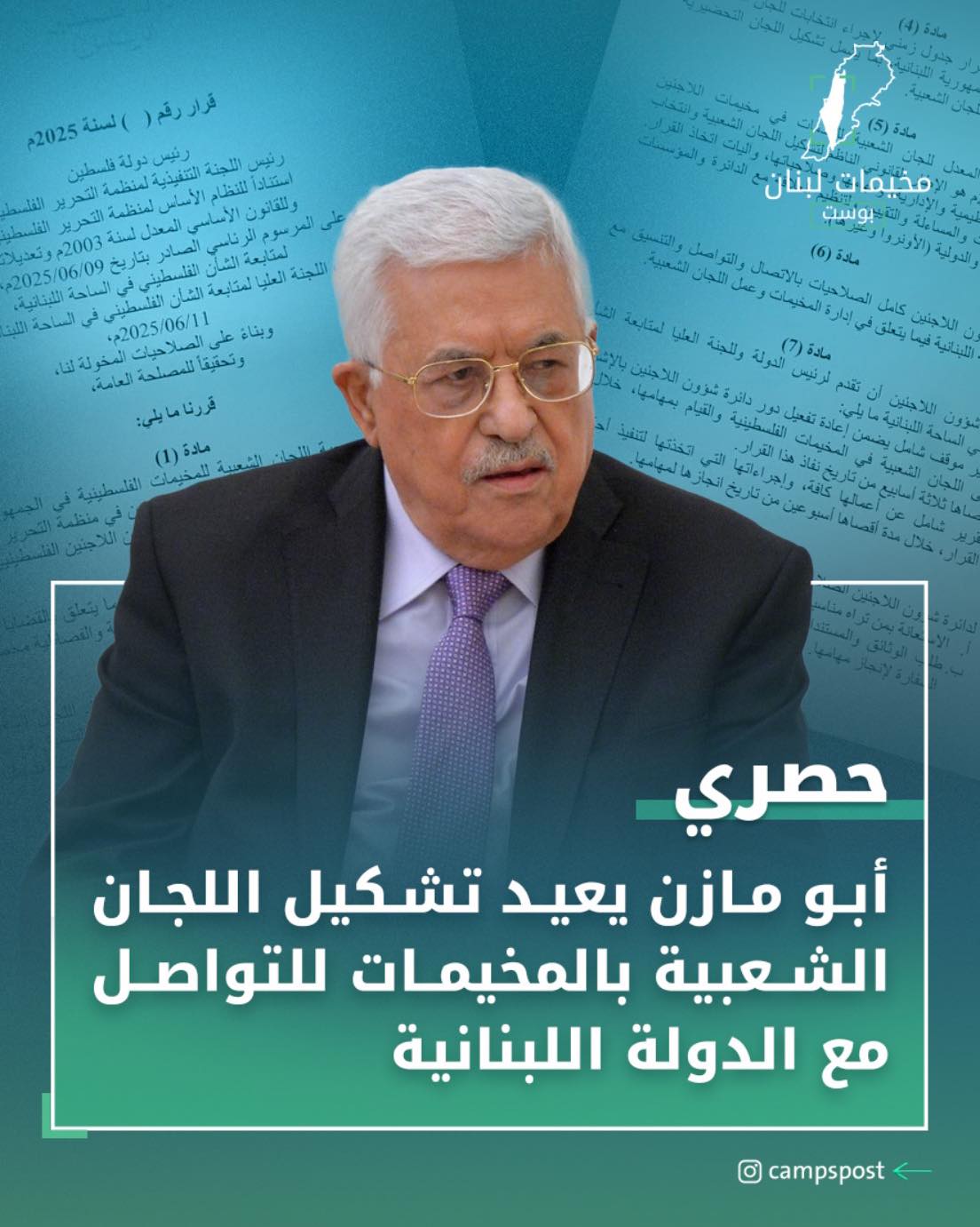 علمت مخيمات لبنان بوست من مصادر خاصة، أن رئيس السلطة الفلسطينية “محمود عباس” أصدر قراراً بضرورة إعادة تشكيل وهيكلة اللجان الشعبية في المخيمات الفلسطينية من الصفر، لتكون هي المعنية بالتواصل مع الدولة اللبنانية بشكل مباشر فيما يخص إدارة المخيمات.