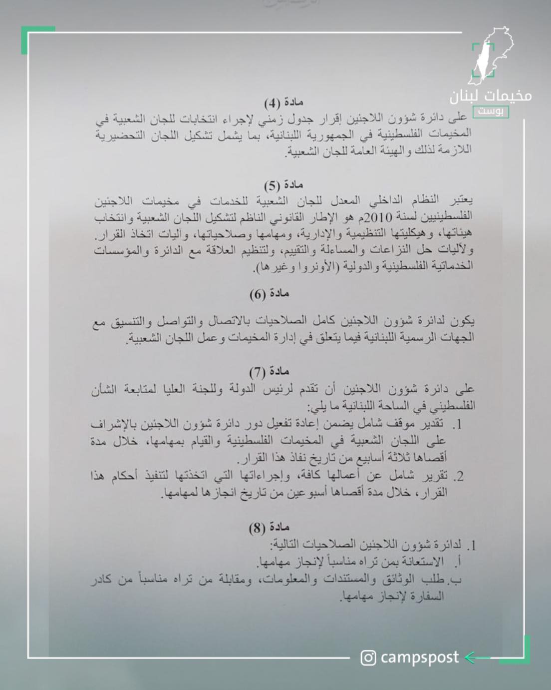 أبو مازن طلب أن تكون اللجان منتخبة، وأن تكون تابعة بشكل مباشر وحصري لدائرة شؤون اللاجئين في رام الله، بشخص “أحمد أبو هولي” على أن تكون الدائرة مطالبة بوضع تقرير شامل عن وضع المخيمات وخطتها لمناقشتها مع الرئيس اللبناني.