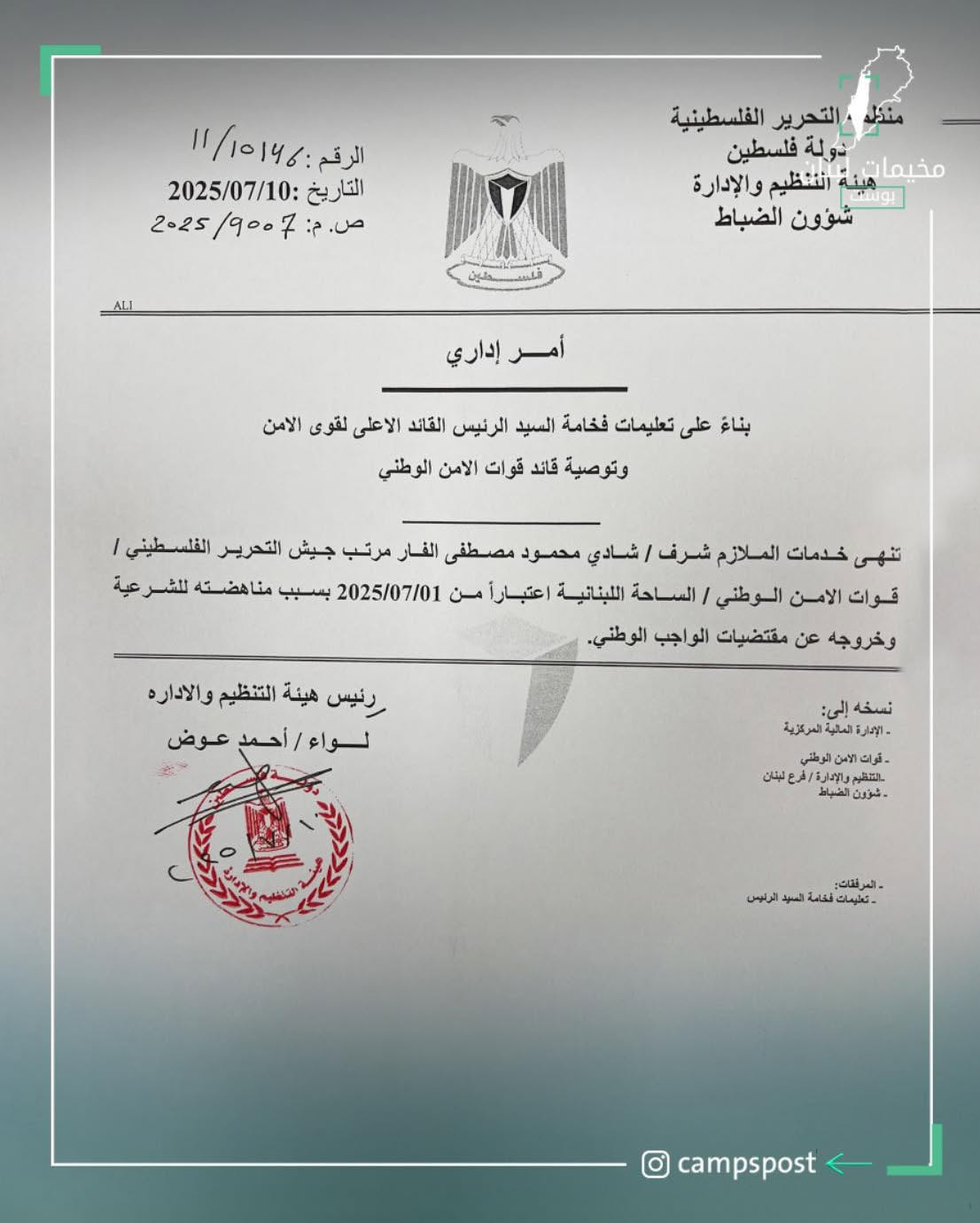 أصدر رئيس السلطة الفلسطينية “محمود عباس”، قرارًا يقضي بفصل مسؤول أمن السفارة في بيروت “شادي الفار”، وإنهاء خدماته بشكل نهائي، بسبب ماوصفه “خروجه عن الإجماع الفتحاوي”، فيما أفادت مصادر أخرى بأن “الفار” متهم بقضايا فساد.