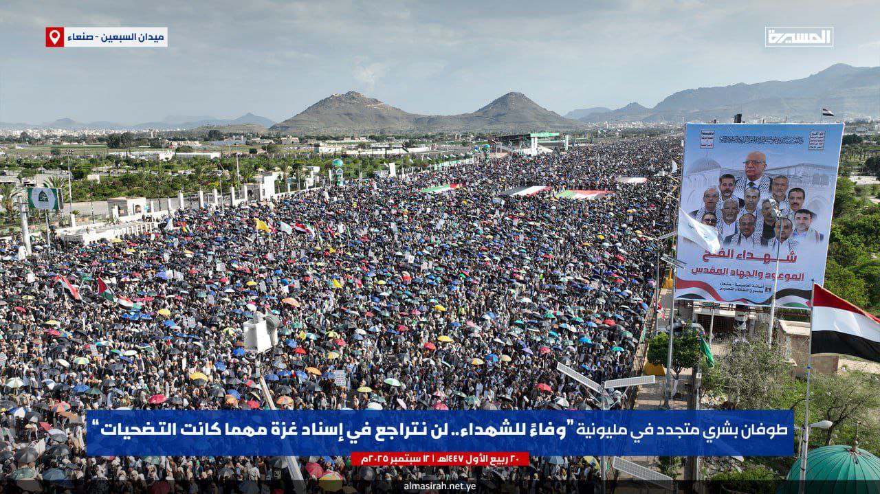 “طوفان بشري” في العاصمة اليمنية صنعاء، تحت شعار: “وفاء للشهداء.. لن نتراجع عن إسناد غزة مهما كانت التضحيات”