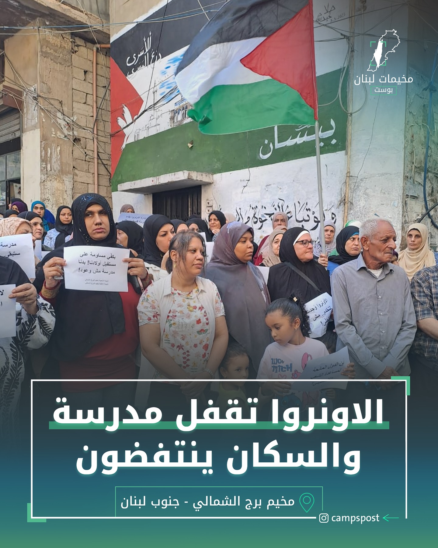 اعتصم أبناء مخيم برج الشمالي للاجئين الفلسطينيين في جنوب لبنان احتجاجاً على قرار الأونروا إقفال مدرسة فلسطين ودمجها مع مدرسة أخرى داخل المخيم، معتبرين أن هذا القرار يشكل خطراً كبيراً على المستوى التعليمي للطلاب.