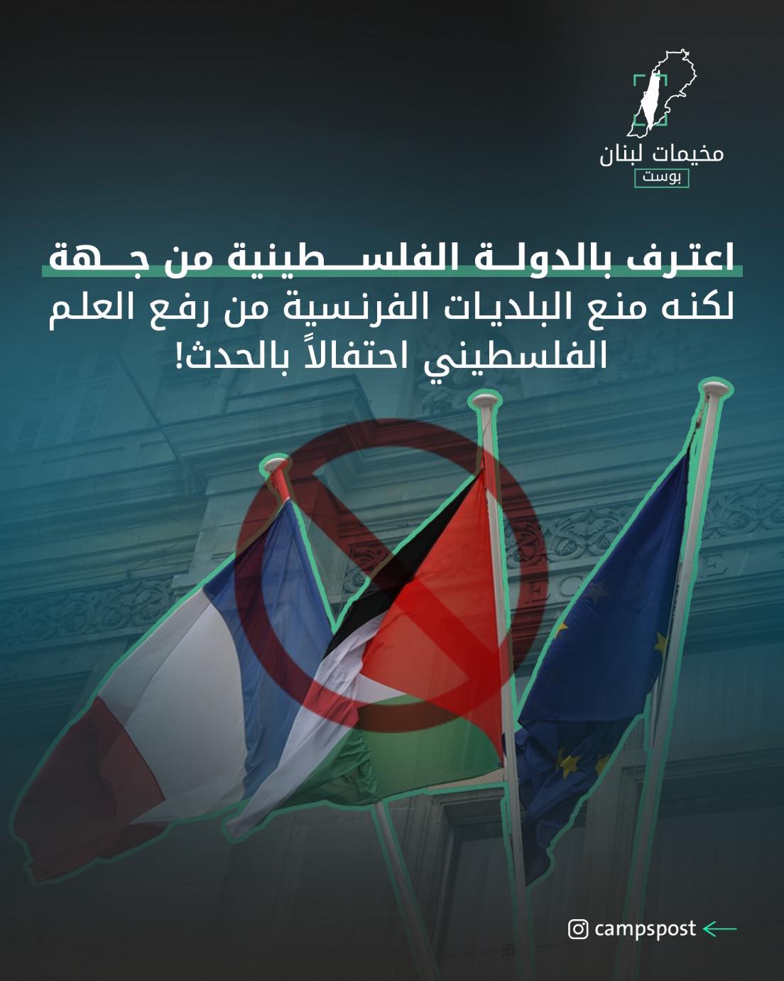 بعد يوم واحد من اعترافه بالدولة الفلسطينية، احتفلت مجموعة من البلديات الفرنسية بهذا الحدث وقررت رفع العلم الفلسطيني على مبانيها، إلا أن #ماكرون أوعز بإنزال الرايات الفلسطينية مباشرةً مهدداً بوضع غرامات مالية كبيرة في حال لم تستجب تلك البلديات.