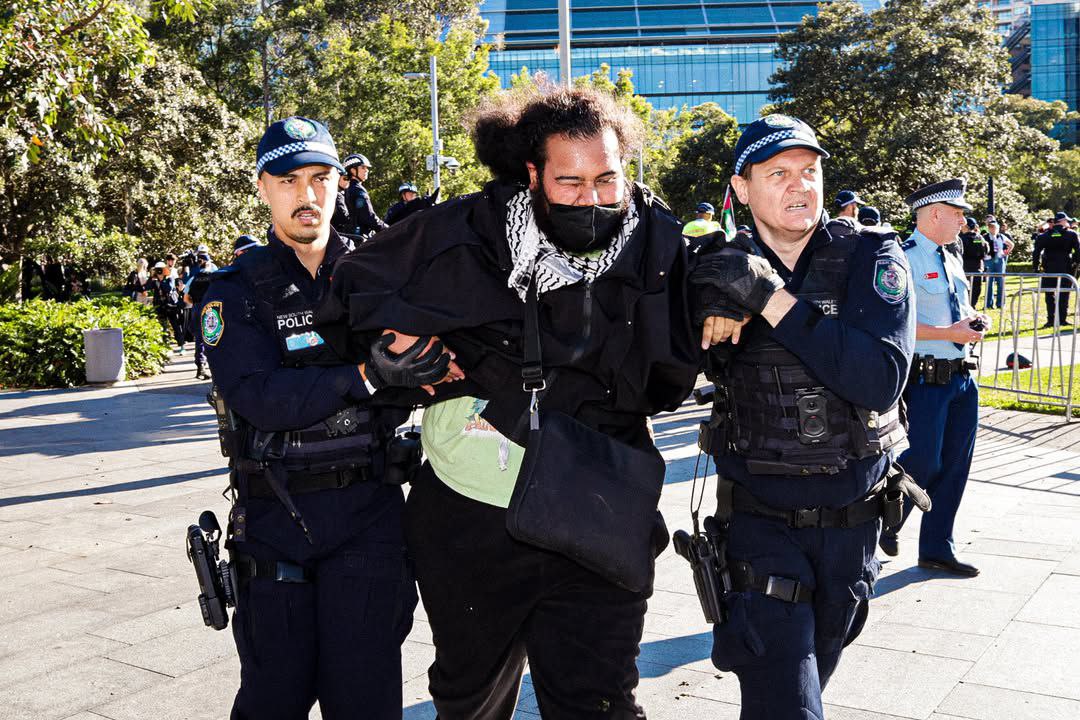 صور متداولة لمتظاهرين لفلسطين حاصروا معرضا للأسلحة في مدينة سيدني الأسترالية، والذي يضم شركات “متورطة في تسليح إسرائيل والمشاركة في العدوان على غزة. والشرطة الأسترالية قمعت المتظاهرين واعتدت عليهم واعتقلت عددا منهم