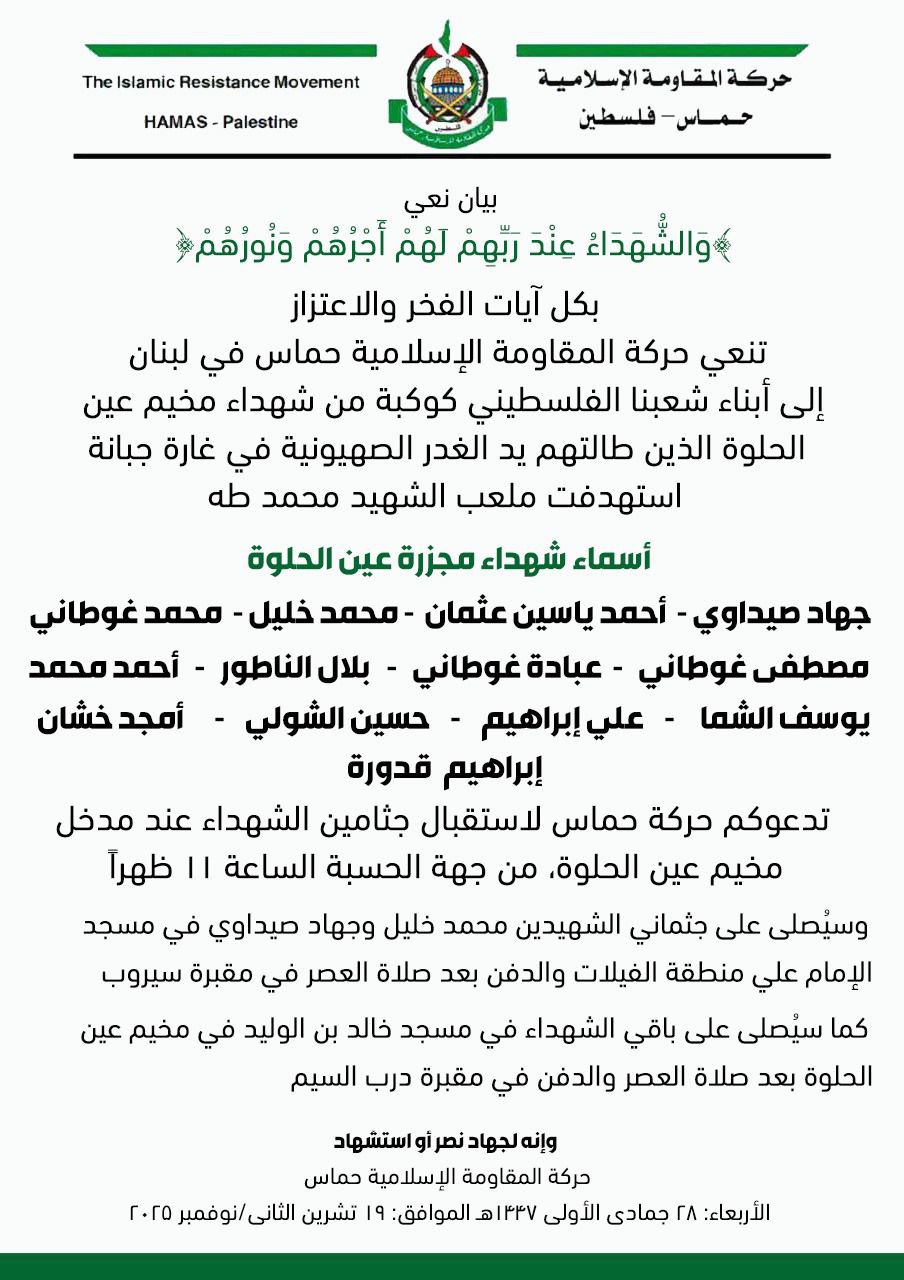 بسم الله الرحمن الرحيم بيان نعي ﴿وَالشُّهَدَاءُ عِنْدَ رَبِّهِمْ لَهُمْ أَجْرُهُمْ وَنُورُهُمْ﴾ بكل آيات الفخر والاعتزاز تنعى حركة المقاومة الإسلامية حماس في لبنان إلى أبناء شعبنا الفلسطيني، وإلى جماهير أمتنا العربية والإسلامية، وإلى جميع أحرار العالم، كوكبة من شهداء مخيم عين الحلوة الذين طالتهم يد الغدر الصهيونية في غارة جبانة استهدفت ملعب الشهيد محمد طه والشهداء هم: ١- جهاد صيداوي ٢- احمد ياسين عثمان ٣- محمد خليل ٤- محمد غوطاني ٥- مصطفى غوطاني ٦- عبادة غوطاني ٧- بلال الناطور ٨- أحمد محمد ٩- يوسف الشما ١٠- علي إبراهيم ١١- حسين الشولي ١٢- أمجد خشان ١٣- إبراهيم قدورة تدعوكم حركة حماس لاستقبال جثامين الشهداء عند مدخل مخيم عين الحلوة، من جهة الحسبة *الساعة 11 ظهراً* وسيُصلى على جثماني الشهيدين محمد خليل وجهاد صيداوي في مسجد الإمام علي منطقة الفيلات عصرا والدفن في مقبرة سيروب. كما سيُصلى على باقي الشهداء في مسجد خالد بن الوليد في مخيم عين الحلوة بعد صلاة العصرا والدفن في مقبرة درب السيم وإنه لجهاد نصر أو استشهاد حركة المقاومة الإسلامية حماس- لبنان