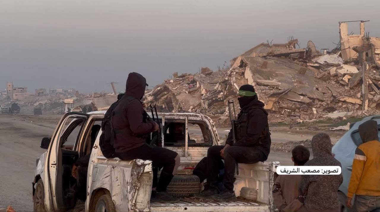 مغادرة مركبات الصليب الأحمر وعناصر القسام برفقة اللجنة المصرية بعد انتهاء عملية البحث عن آخر جثة إسرائيلية محتجزة لدى كتائب القسام في حي الزيتون شرق مدينة غزة