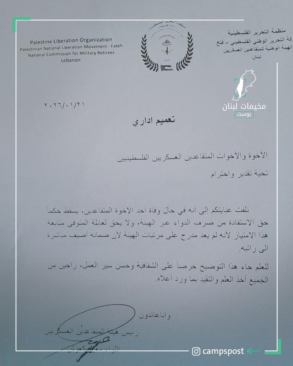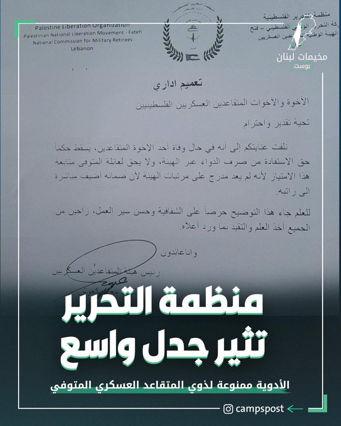 أثار قرار منظمة التحرير بوقف صرف الأدوية لذوي المتقاعدي العسكري بعد وفاته، موجة من الانتقادات تجاه القرار وتخوف من تقليصات جديدة تمس المتقاعدين والشهـ.ـداء وذويهم.