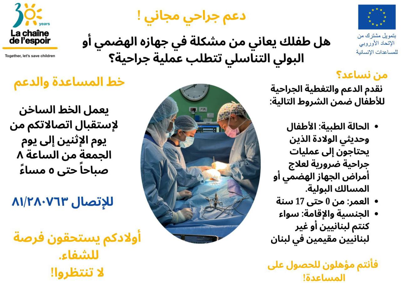 دعم جراحي مجاني للأطفال في لبنان أعلنت جمعية سلسلة الأمل La Chaine de l’Espoir، وبدعم من الاتحاد الأوروبي للمساعدات الإنسانية، عن توفير دعم جراحي مجاني للأطفال الذين يعانون من أمراض في الجهاز الهضمي او البولي التناسلي. ويشمل البرنامج الأطفال من عمر 0 الى 17 سنة من اللبنانيين وغير اللبنانيين المقيمين في لبنان. للاستفادة، يمكن للأهالي التواصل عبر الرقم 81/280763 من الاثنين الى الجمعة بين الساعة 8 صباحا و 5 مساء.