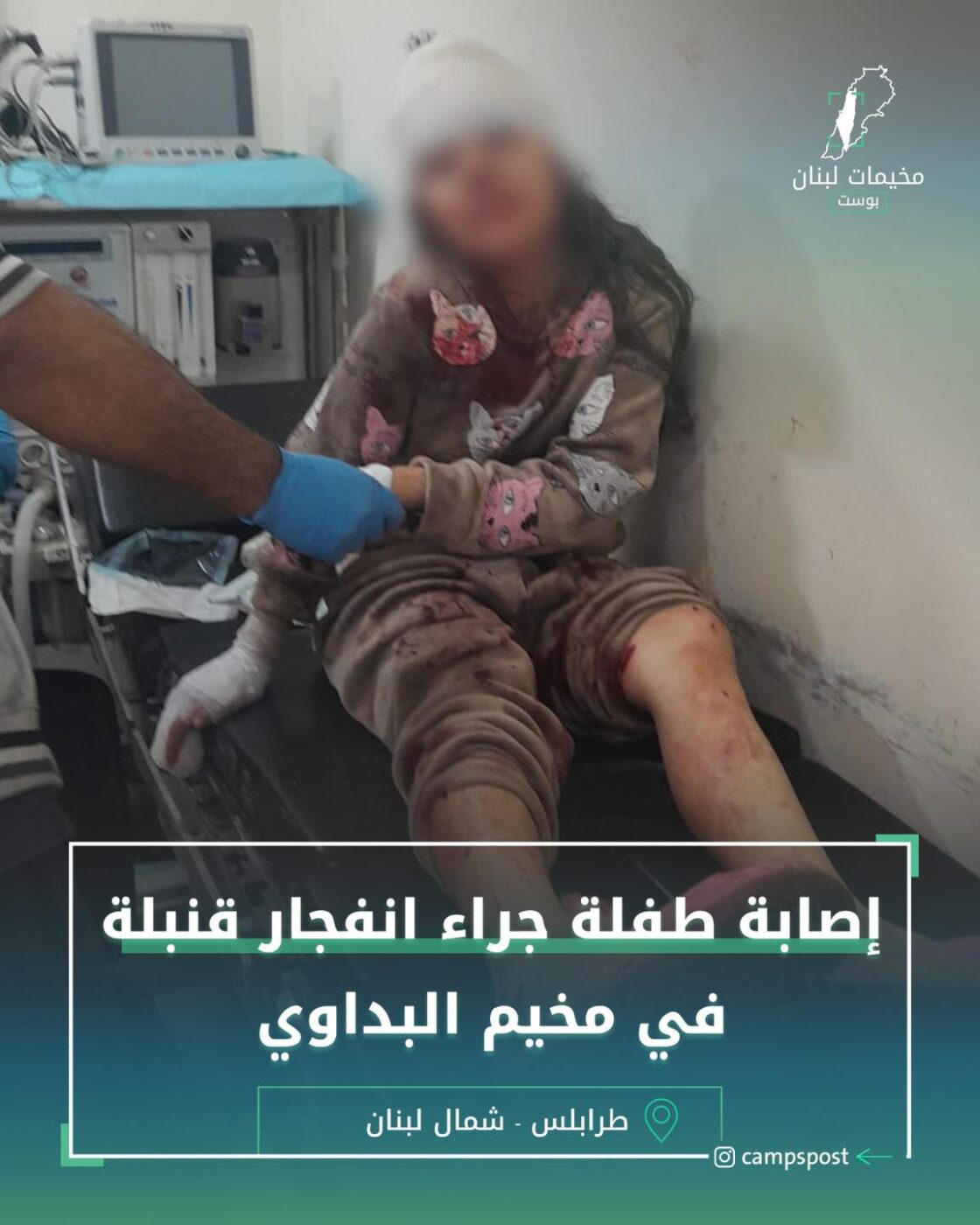 ثلاث إصابات منها طفلة جراء انفجار قنبلة في مخيم البداوي على خلفية الاشكال بين عائلة زيد والأمن الوطني.