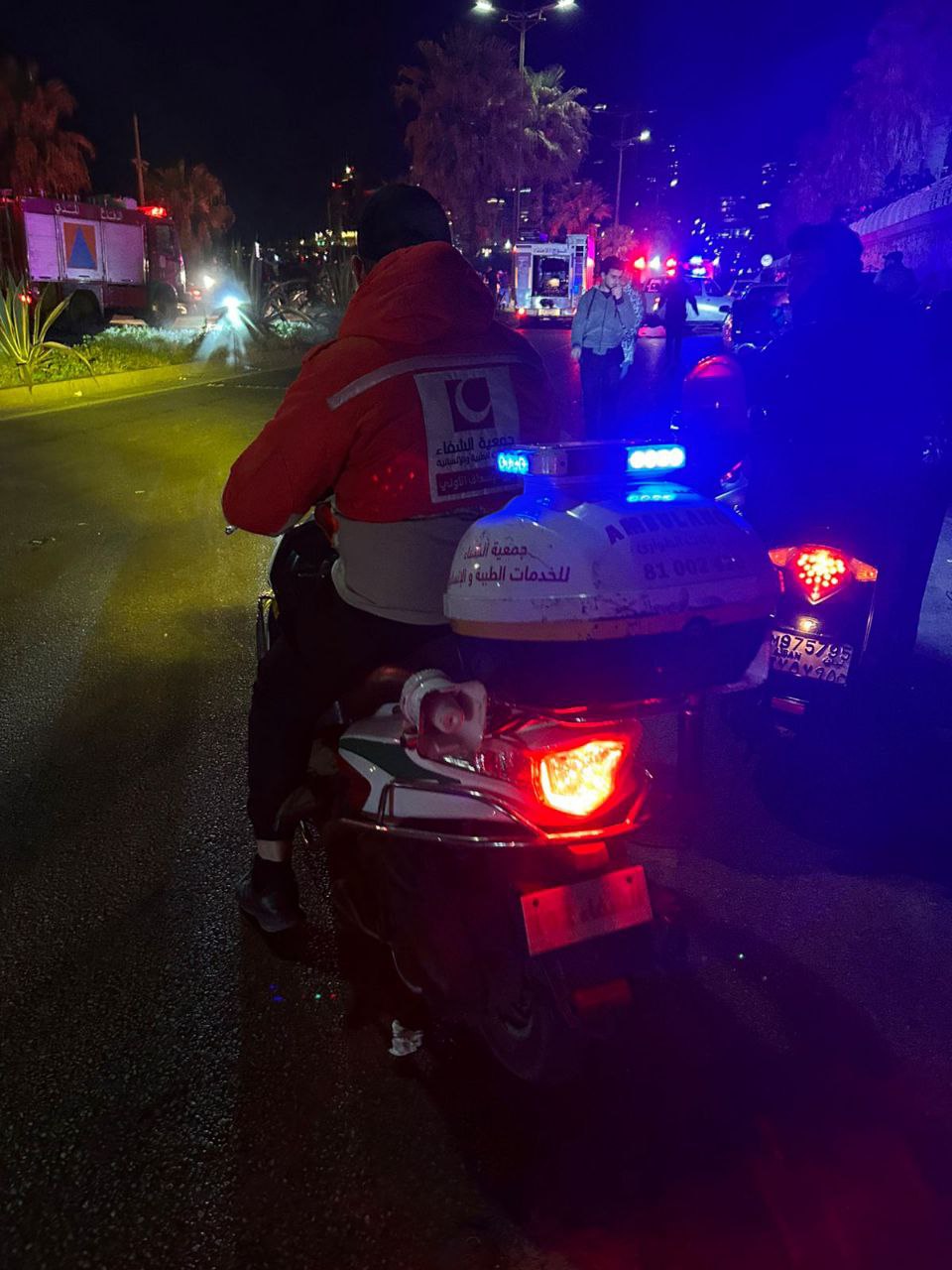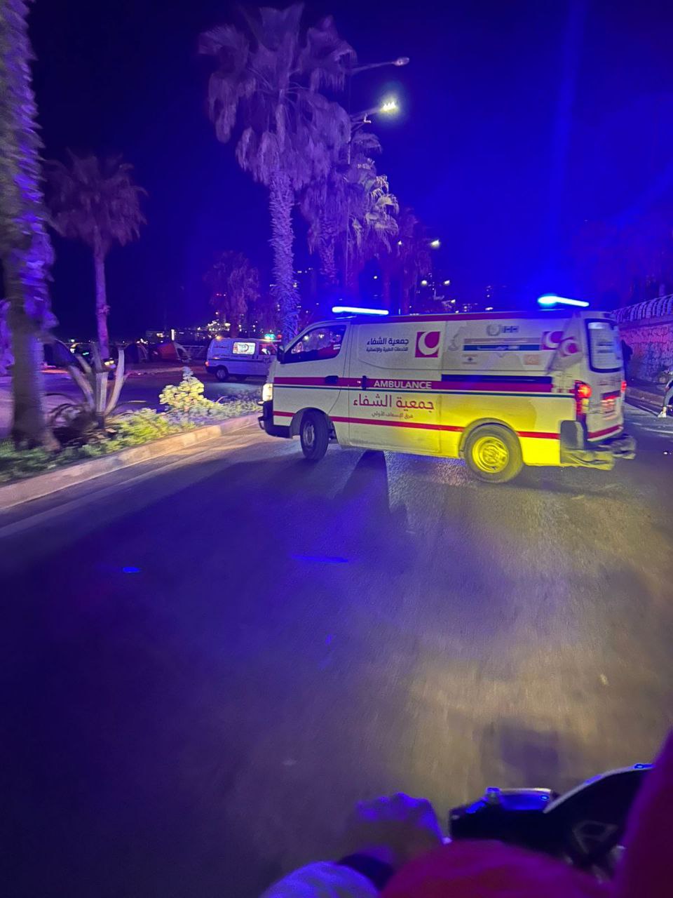 إسعاف جمعية الشفاء للخدمات الطبية والإنسانية يصل إلى مكان الغارة الصهيونية التي استهدفت منطقة الرملة البيضاء في العاصمة اللبنانية بيروت.