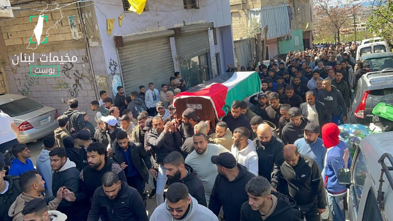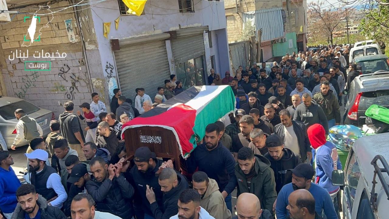 تشييع الشهيد ربيع حليحل في مخيم البرج الشمالي للاجئين الفلسطينيين، بعد ارتقائه اليوم إثر غارة استهدفت دراجته النارية في مدينة صور جنوب لبنان.