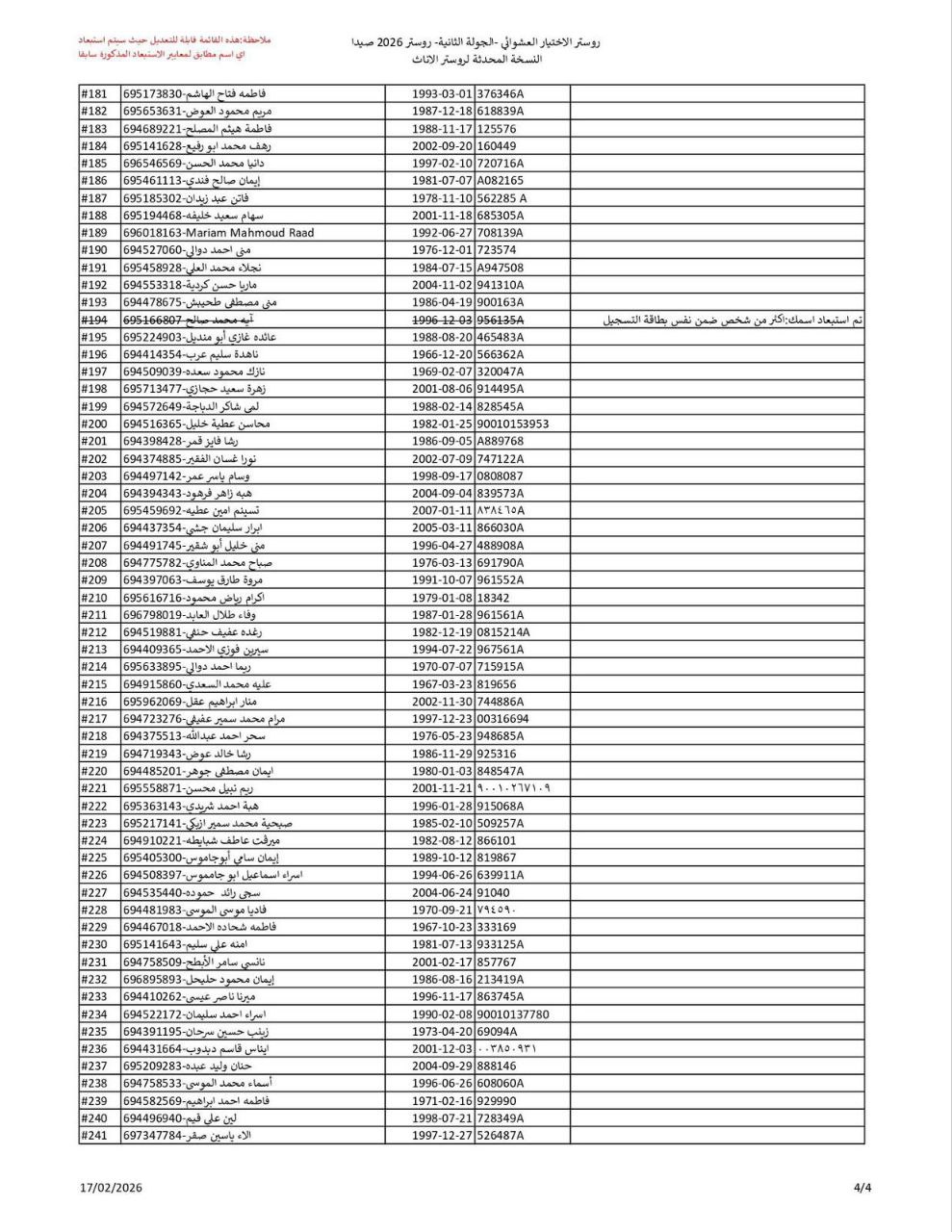 هذه لوائح الاسماء المحدثة التي تم اختيارها بتاريخ 17 شباط/فبراير 2026 لروستر صيدا, الجولة الثانية, روستر الاناث 2026.