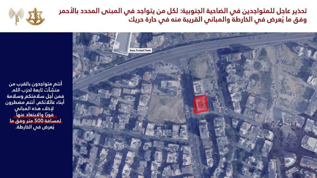 جيش الاحتلال يهدد سكان منطقة حارة حريك ،برج البراجنة,الحدث،الغبيري في الضاحية الجنوبية لبيروت ويطالبهم بالإخلاء