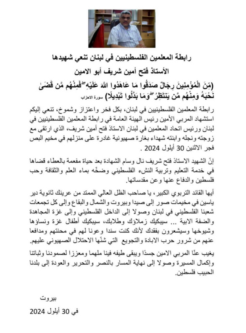 رابطة المعلمين الفلسطينيين في لبنان، بكل فخر واعتزاز وشموخ، تنعي إليكم استشهاد المربي الأمين رئيس الهيئة العامة في رابطة المعلمين الفلسطينيين في لبنان ورئيس اتحاد المعلمين في لبنان الاستاذ فتح أمين شريف، الذي ارتقى مع زوجته ونجله وابنته شهداء بغارة صهيونية غادرة على منزلهم في مخيم البص فجر الاثنين 30 أيلول 2024 .