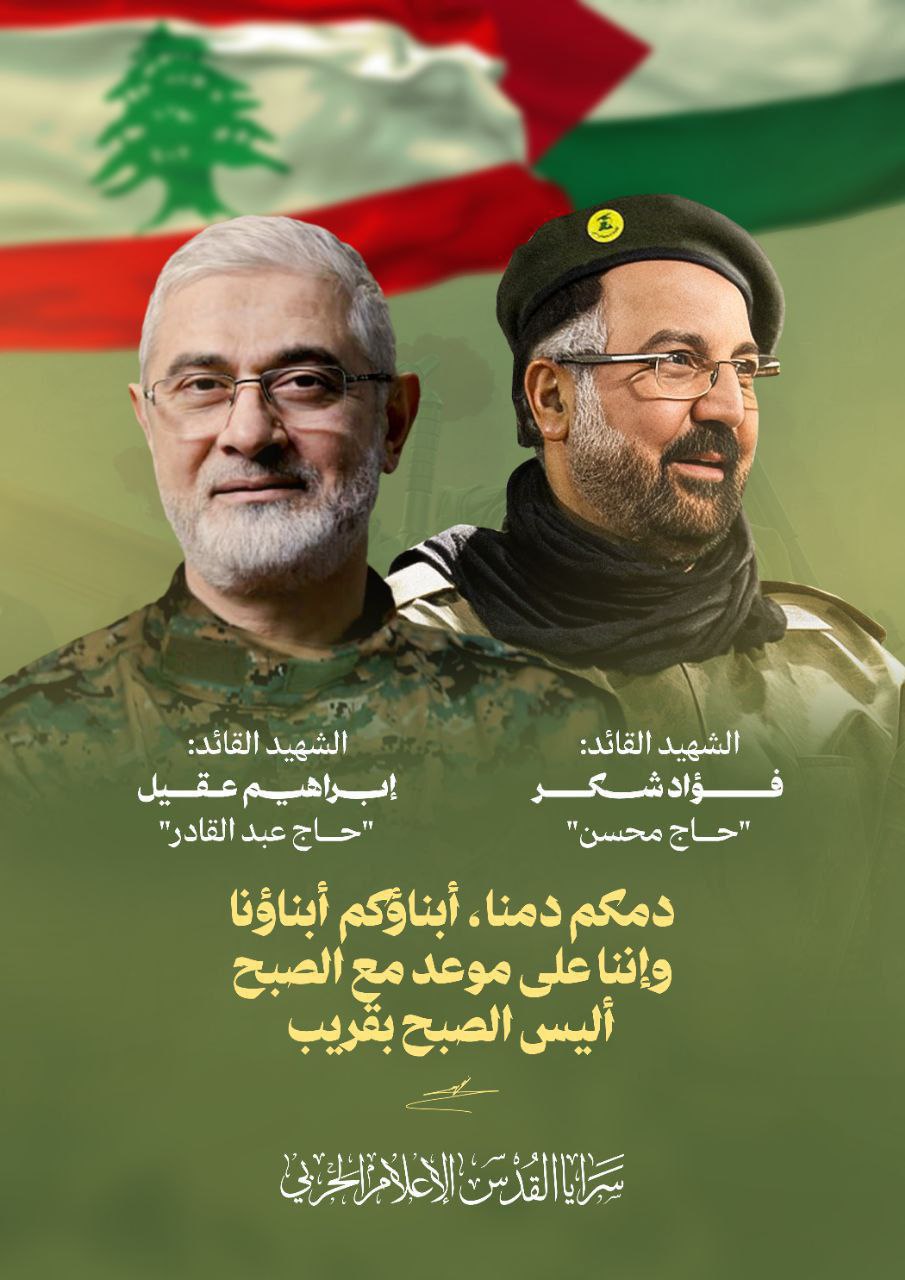 سرايا القدس تنعى القائد الكبير في حزب الله " الحاج إبراهيم عقيل" ورفاقه القادة والمجاهدين.
